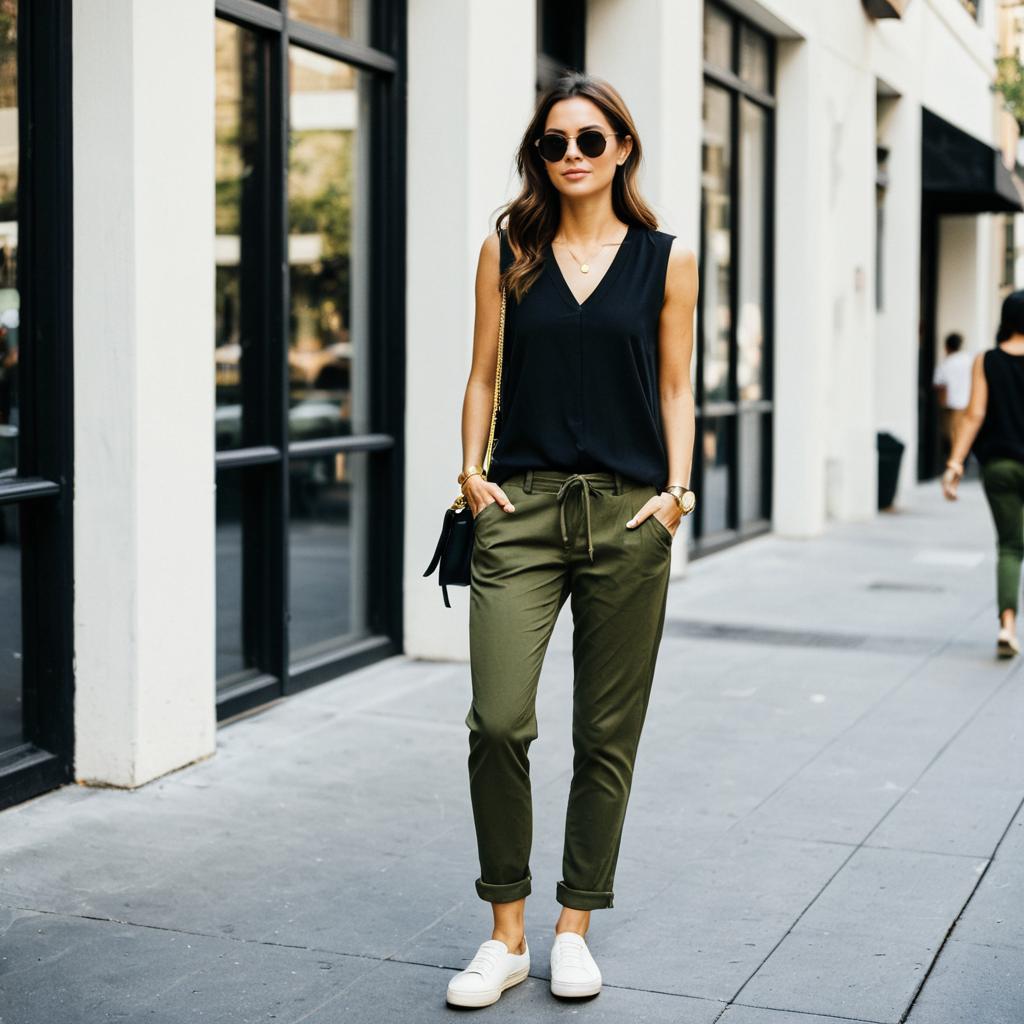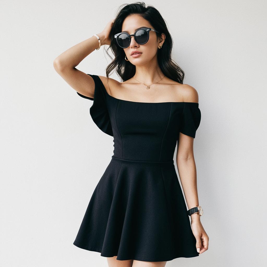 Woman, chic, fitted sleeveless tank dress in light grey, scoop neck, knee-length, black strappy flat sandals, oversized round sunglasses, chunky metallic choker necklace, carrying a black clutch.