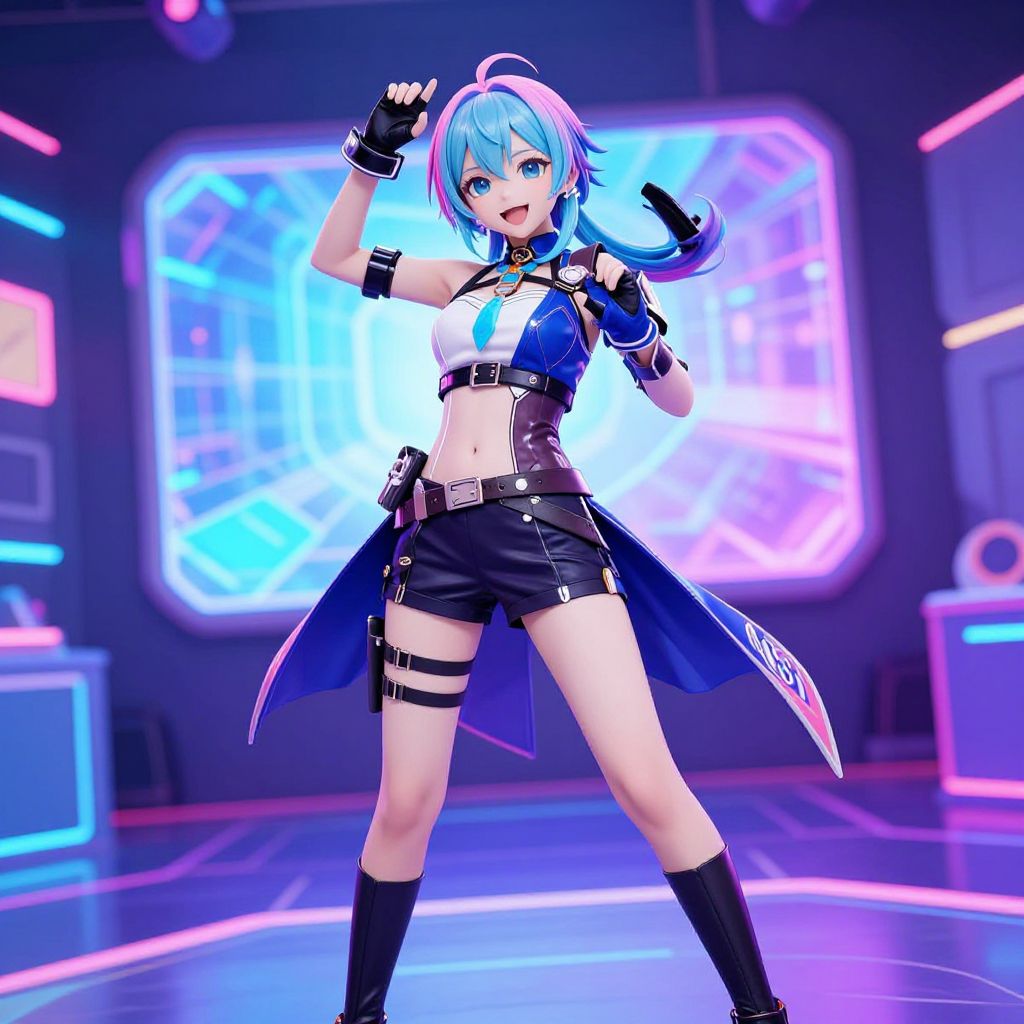 Vtuber poses in a vibrant, futuristic virtual studio setting, showcasing dynamic and expressive stances with neon lighting, holographic backgrounds, and a sleek anime-style character with colorful hair and detailed costume, digital art.