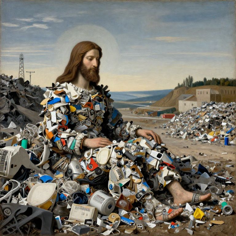 Bauhaus a god made entirely of garbage sitting in a landfill, landscape, religious iconography, landfill, wide angle, painting, Renaissance, dull colours,