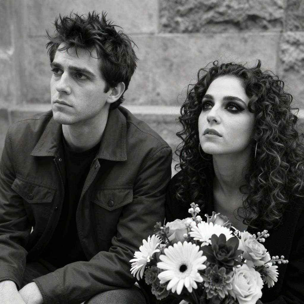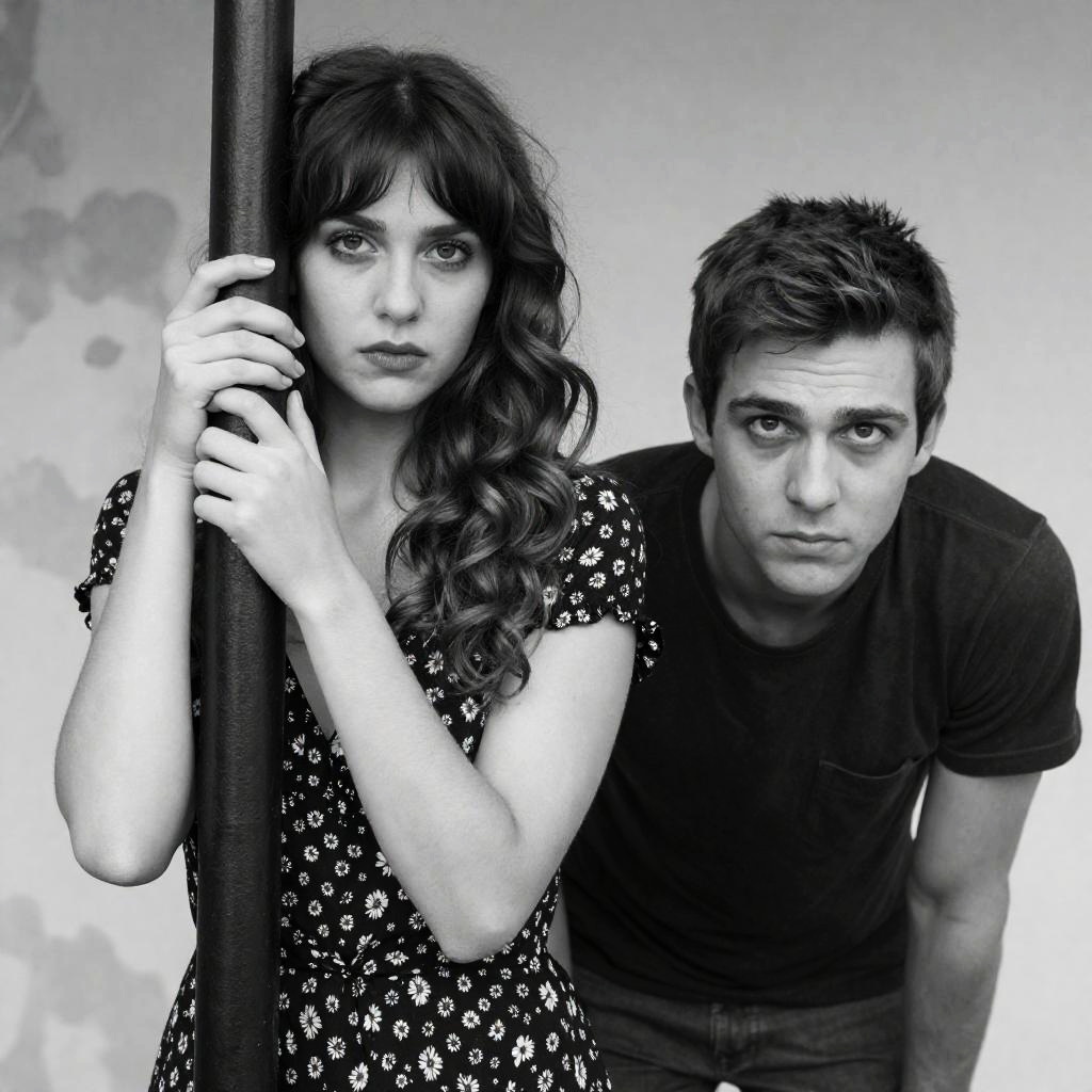 Black and white photograph featuring a young woman with wavy hair and bangs wearing a floral dress, holding a wrought iron column. Beside her, a young man with short hair wearing a dark t-shirt leans forward. Both subjects have intense expressions and look directly at the camera against a worn, patterned background.