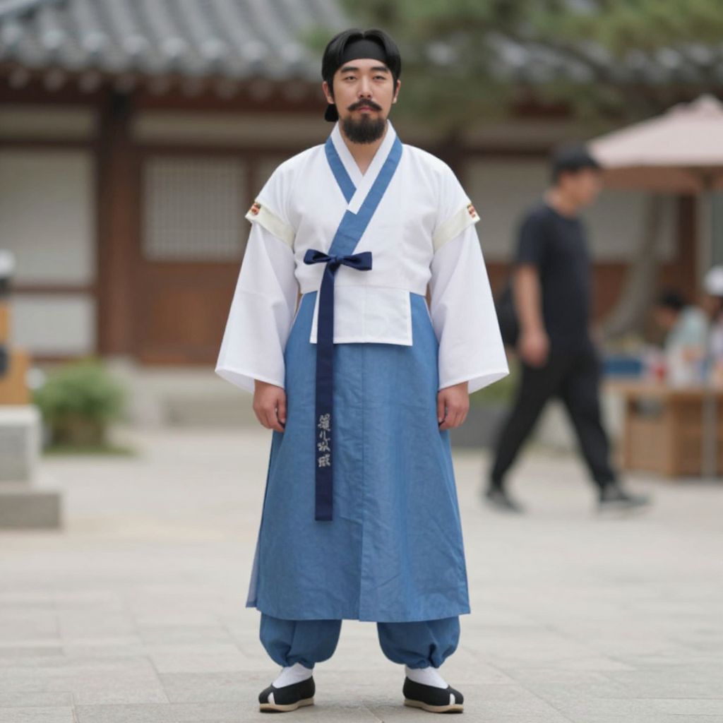 Nebulus clothing costume, 1boy, male focus, facial hair, solo, black hair, beard, standing, outdoors, full body, blurry, mustache, korean clothes