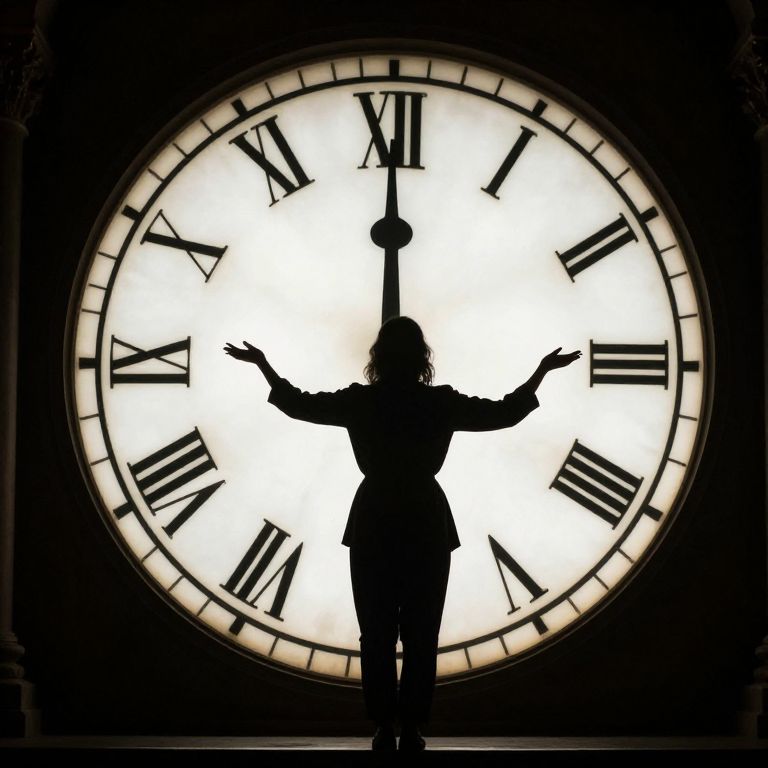 Silhouetted against the luminous face of an ancient clock, a solitary figure stands in the shadow of eternity, their outstretched arms echoing the timeless dance of hands, while the air hums with the quiet symphony of passing moments.