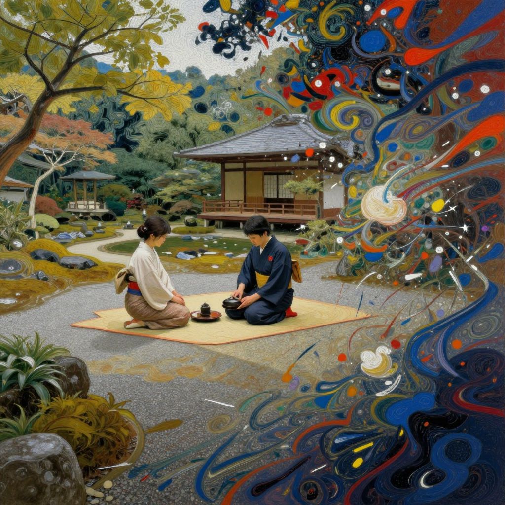 Digital art depicting a serene Japanese garden scene. A man and woman, both with short black hair and traditional attire, sit on a beige mat facing each other. The woman wears a white kimono, while the man is in a navy kimono. They sit on a gravel path, with a traditional wooden house in the background. The garden features lush greenery, a winding stone path, and a small pond. The right side of the image is adorned with vibrant, swirling abstract patterns in red, blue, yellow, and black, adding a surreal touch. The overall style is colorful and whimsical, blending traditional Japanese elements with modern, abstract art.