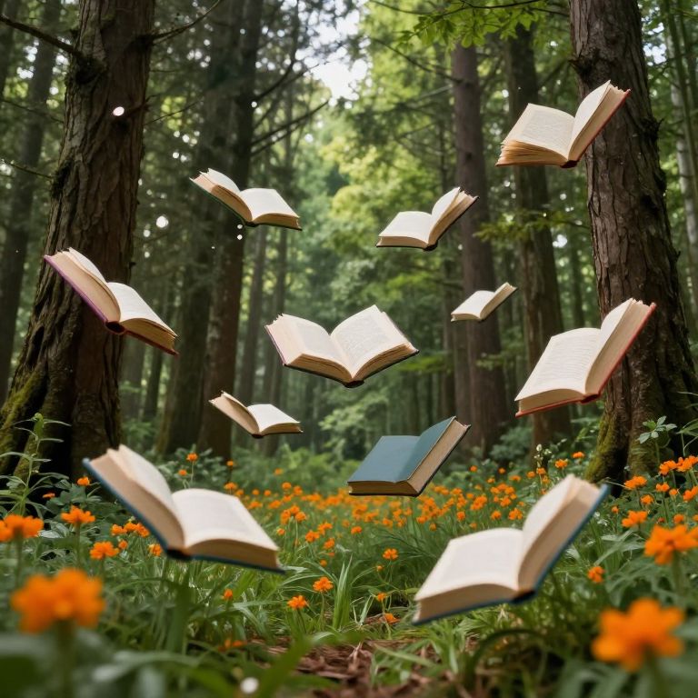 Books float gracefully through a serene forest, their colorful spines and open pages dancing amidst towering trees and vibrant orange wildflowers, creating a whimsical scene where knowledge and nature intertwine.