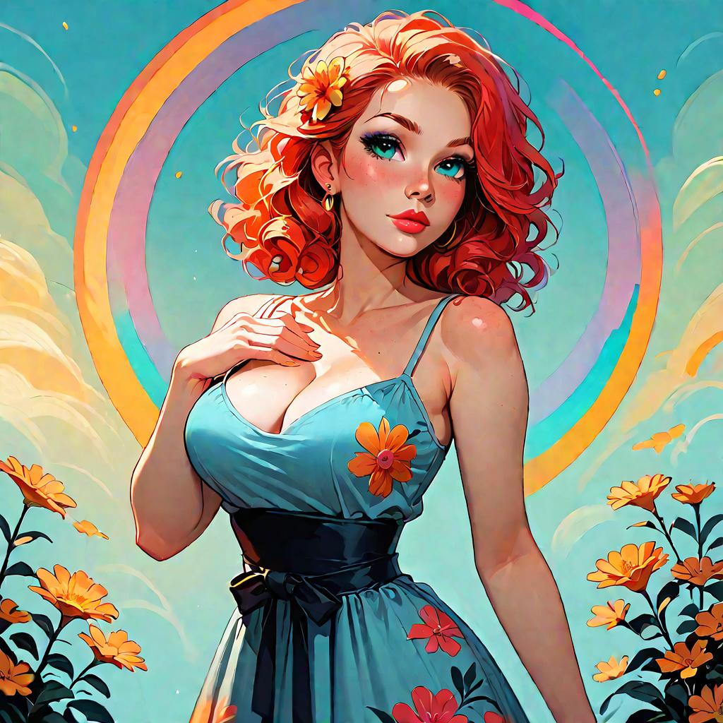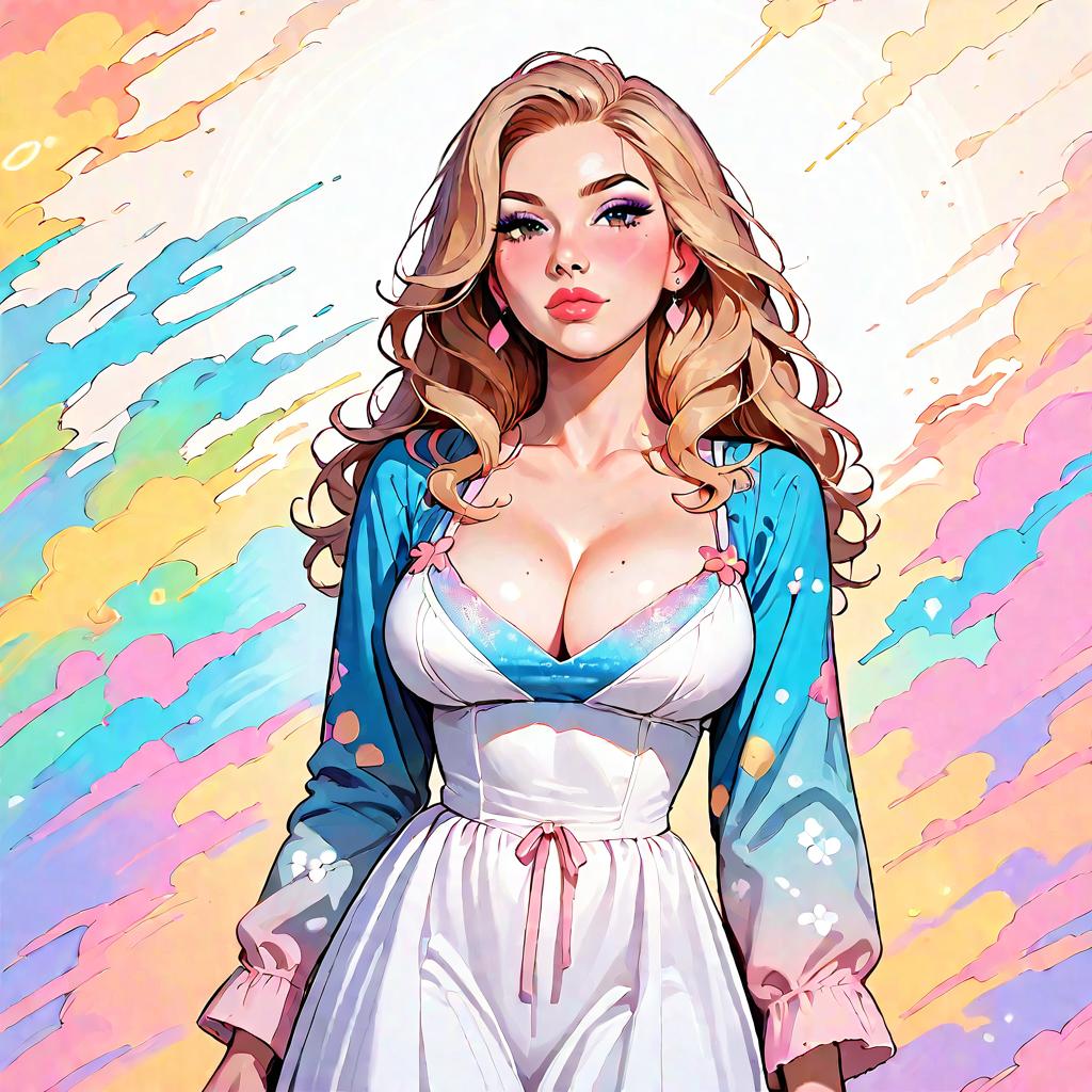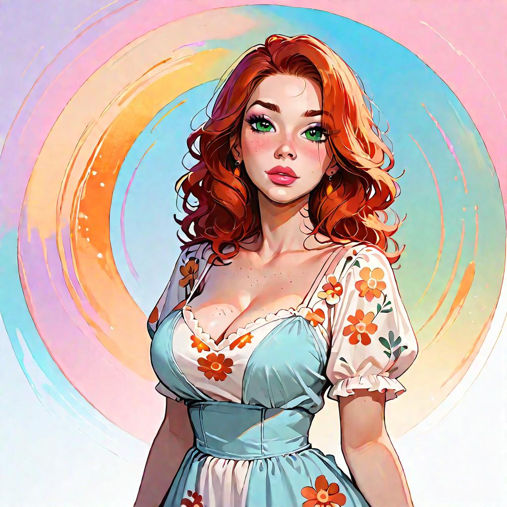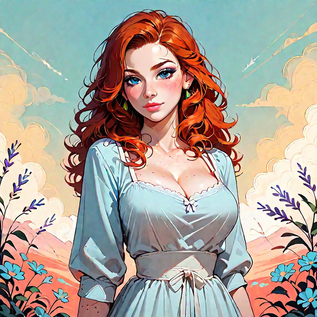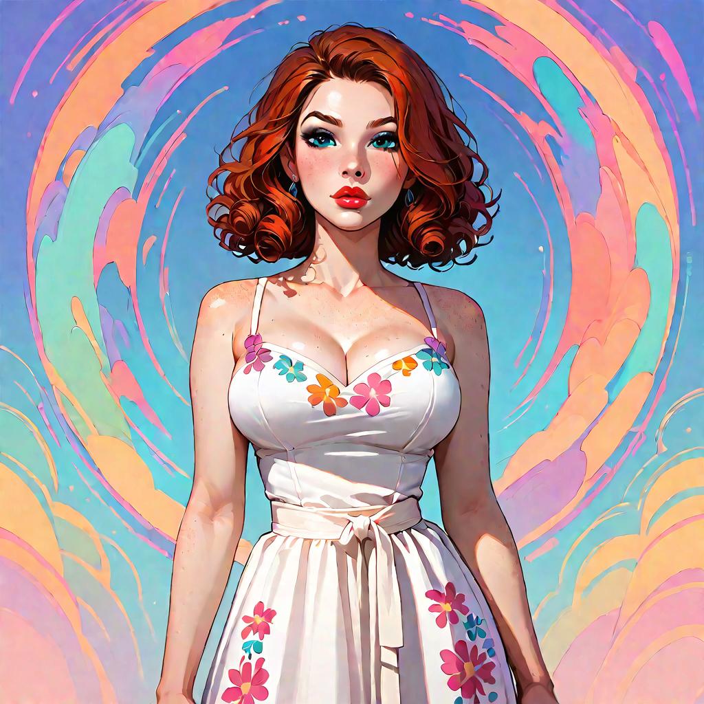 Illustration of a red-haired woman with freckles and soft curls, wearing a white spaghetti strap dress that accentuates cleavage and has a tie waist. She is posed standing with her hands gently holding the sides of her dress. The background features a vibrant, colorful abstract sky with soft clouds in pink, yellow, and blue tones, giving a dreamy and artistic atmosphere.