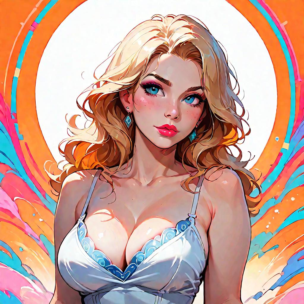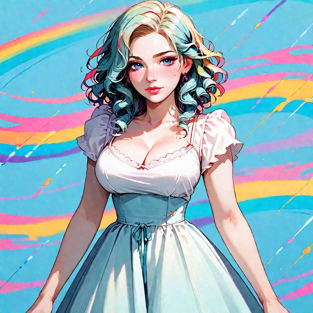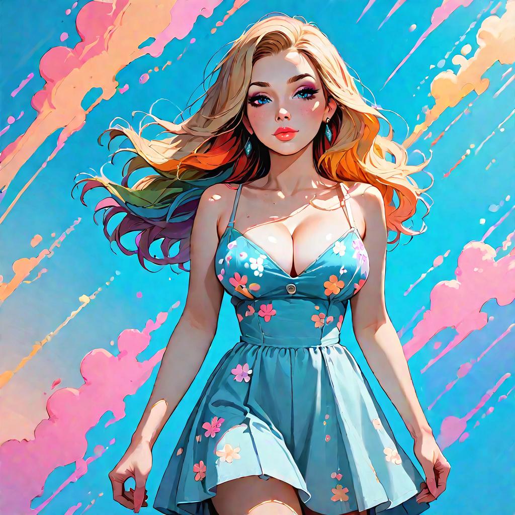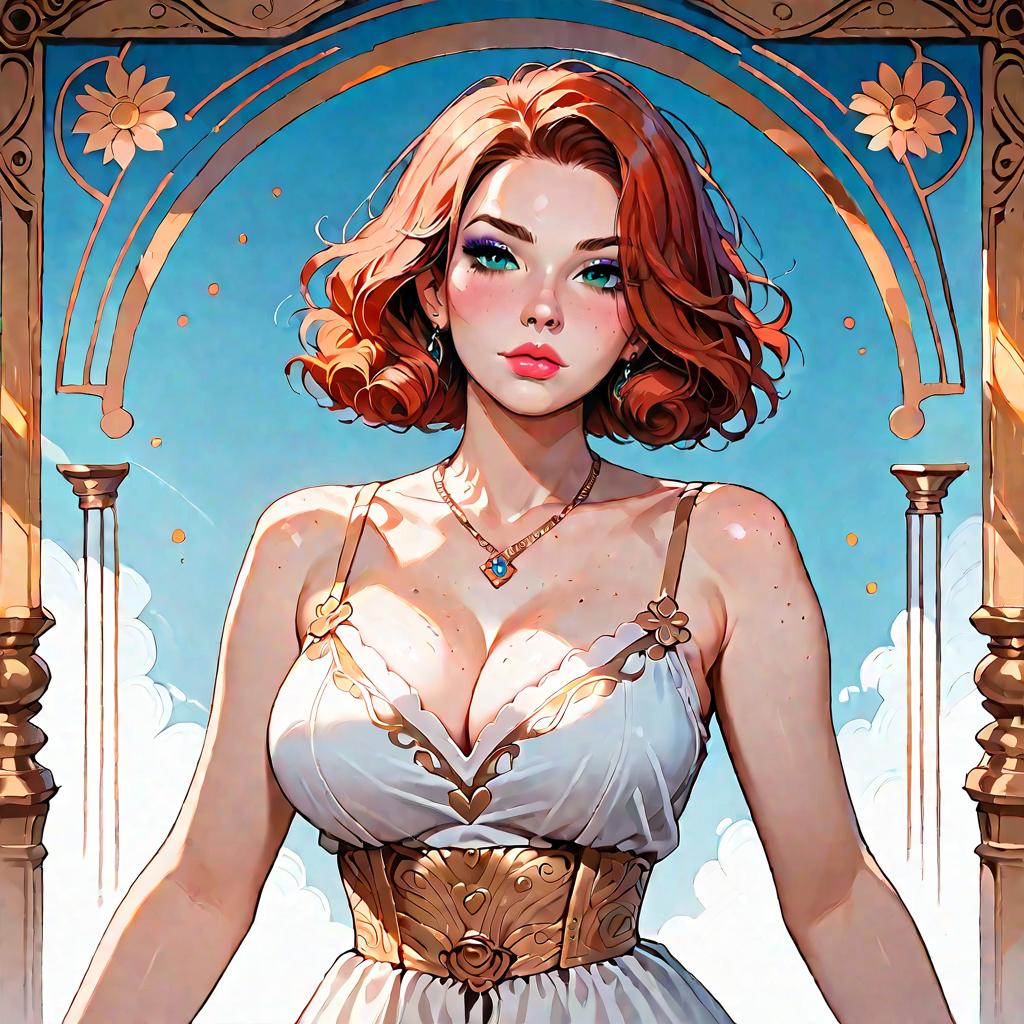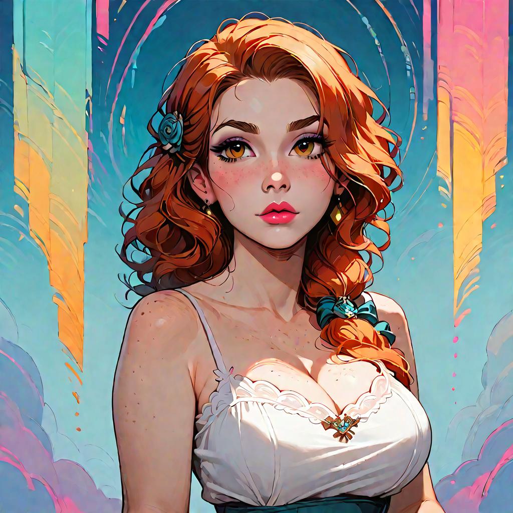 Illustration of a red-haired woman with freckles and soft curls, wearing a white spaghetti strap dress that accentuates cleavage and has a tie waist. She is posed standing with her hands gently holding the sides of her dress. The background features a vibrant, colorful abstract sky with soft clouds in pink, yellow, and blue tones, giving a dreamy and artistic atmosphere.