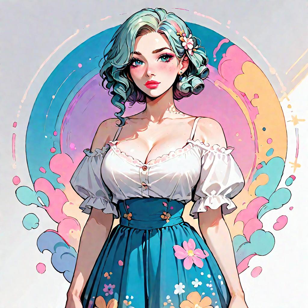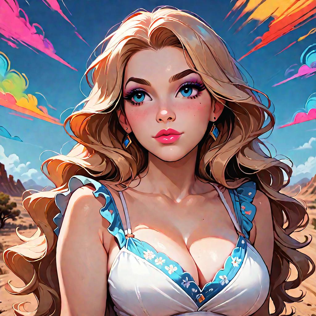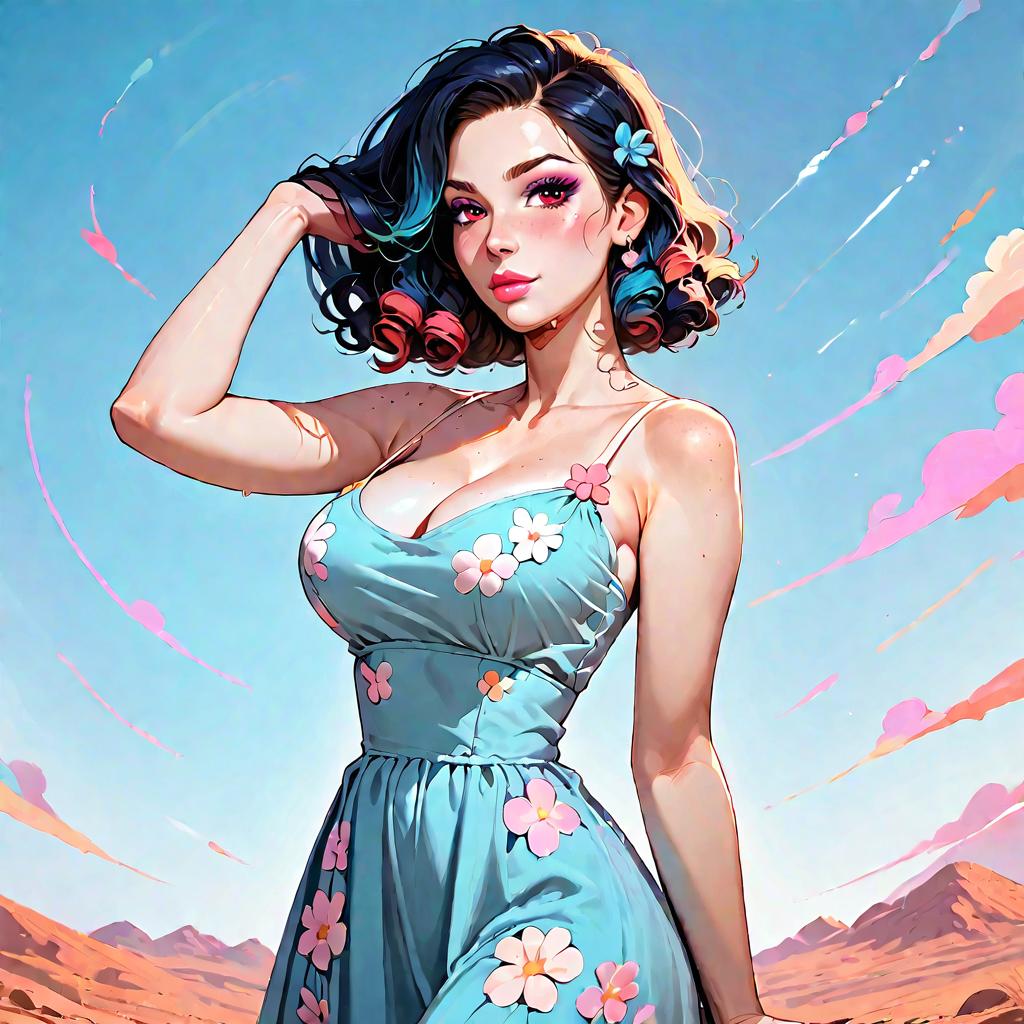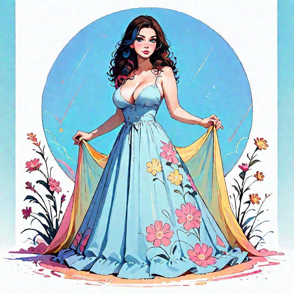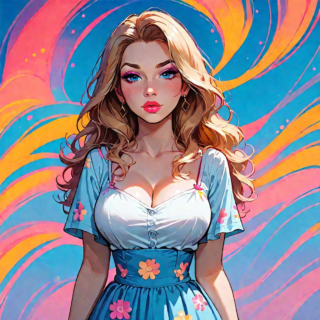 Illustration of a red-haired woman with freckles and soft curls, wearing a white spaghetti strap dress that accentuates cleavage and has a tie waist. She is posed standing with her hands gently holding the sides of her dress. The background features a vibrant, colorful abstract sky with soft clouds in pink, yellow, and blue tones, giving a dreamy and artistic atmosphere.