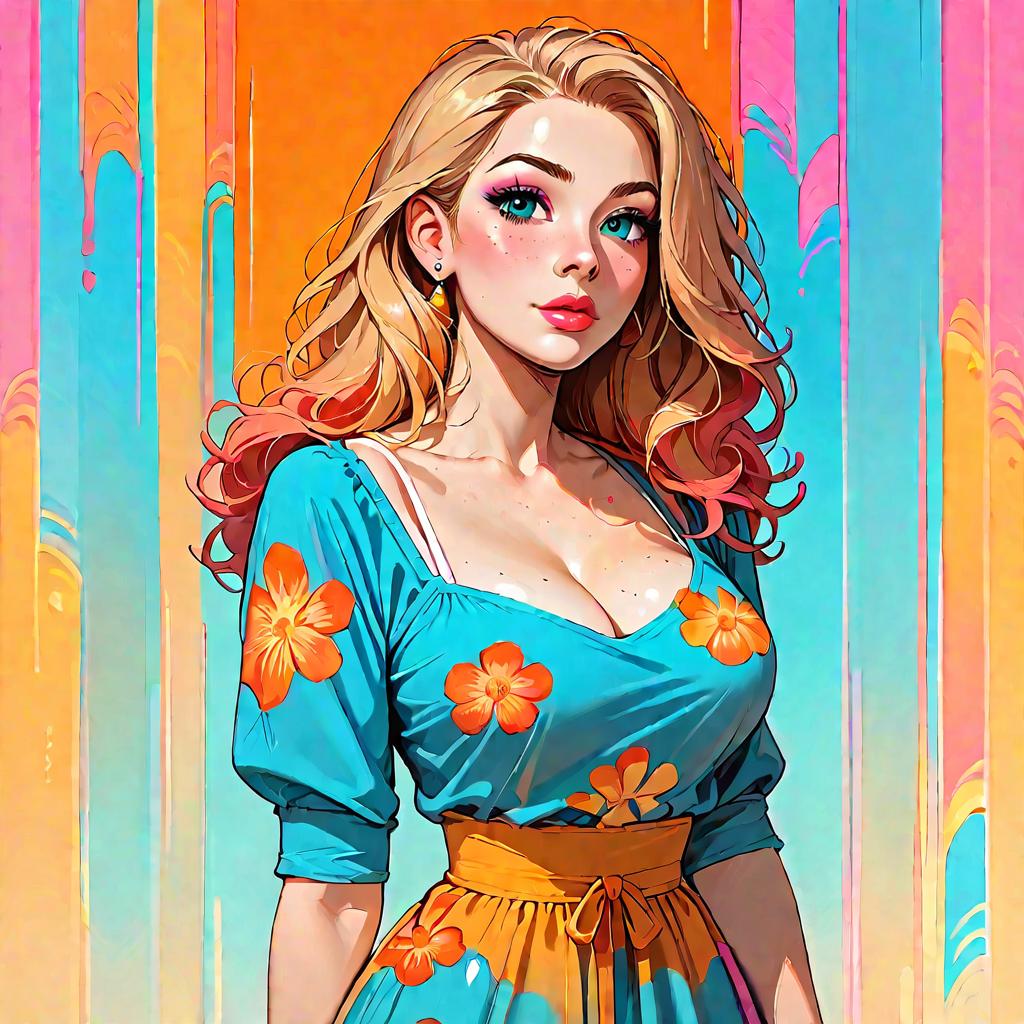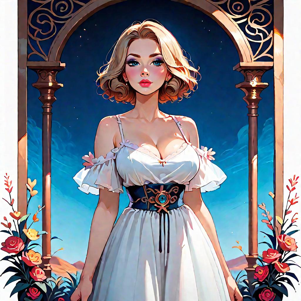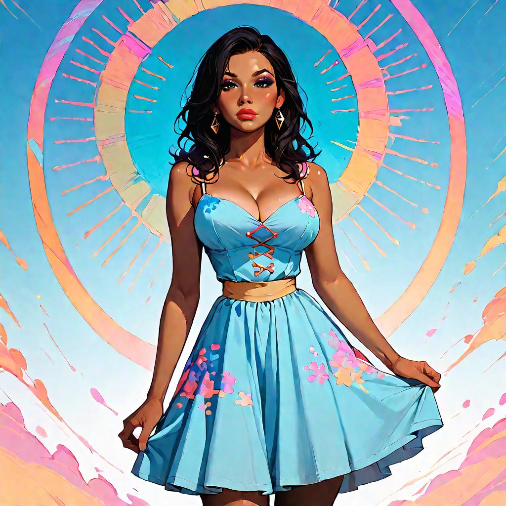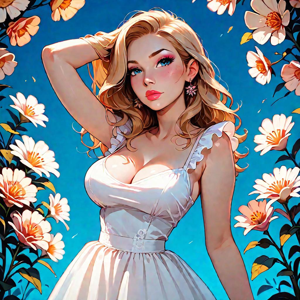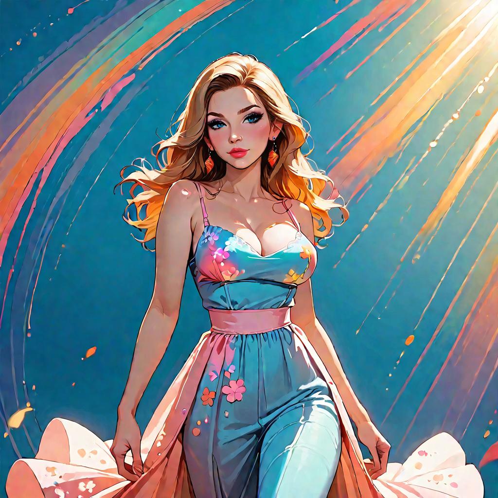 Illustration of a red-haired woman with freckles and soft curls, wearing a white spaghetti strap dress that accentuates cleavage and has a tie waist. She is posed standing with her hands gently holding the sides of her dress. The background features a vibrant, colorful abstract sky with soft clouds in pink, yellow, and blue tones, giving a dreamy and artistic atmosphere.
