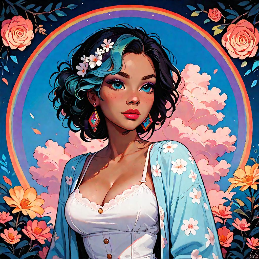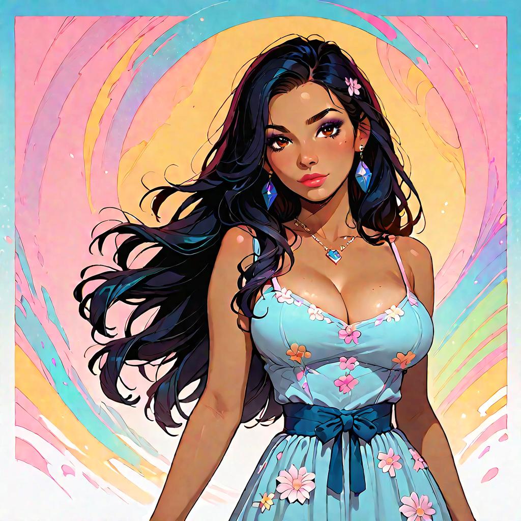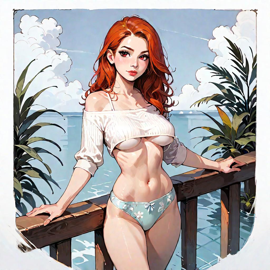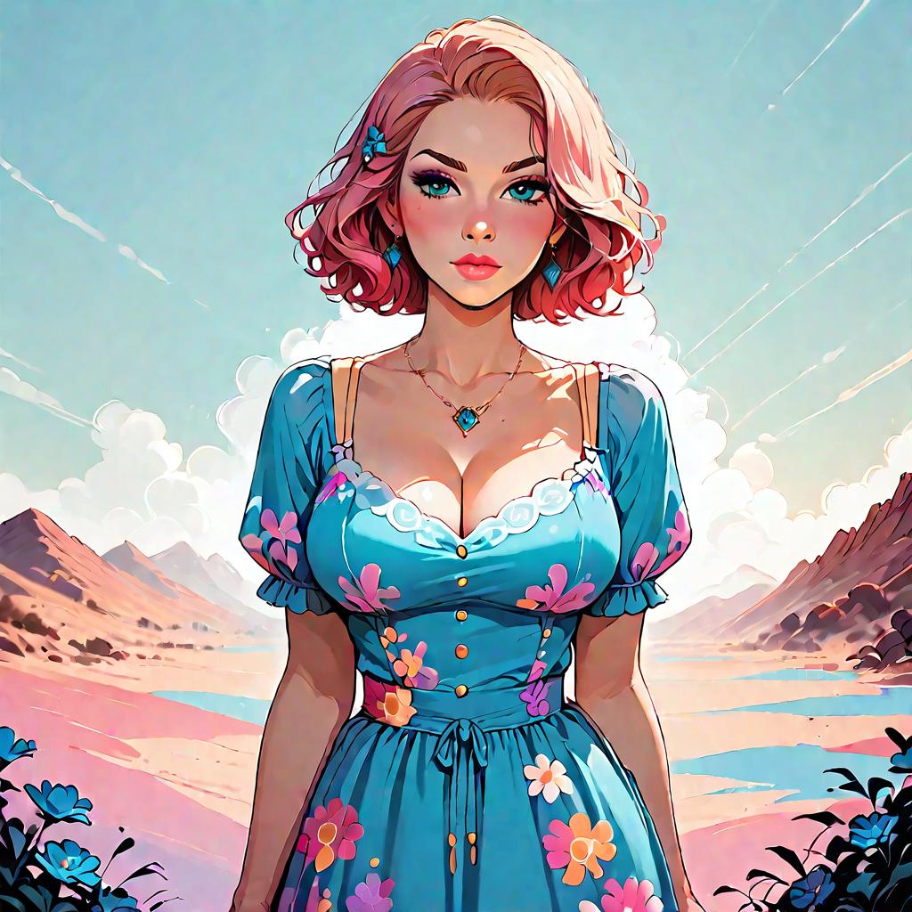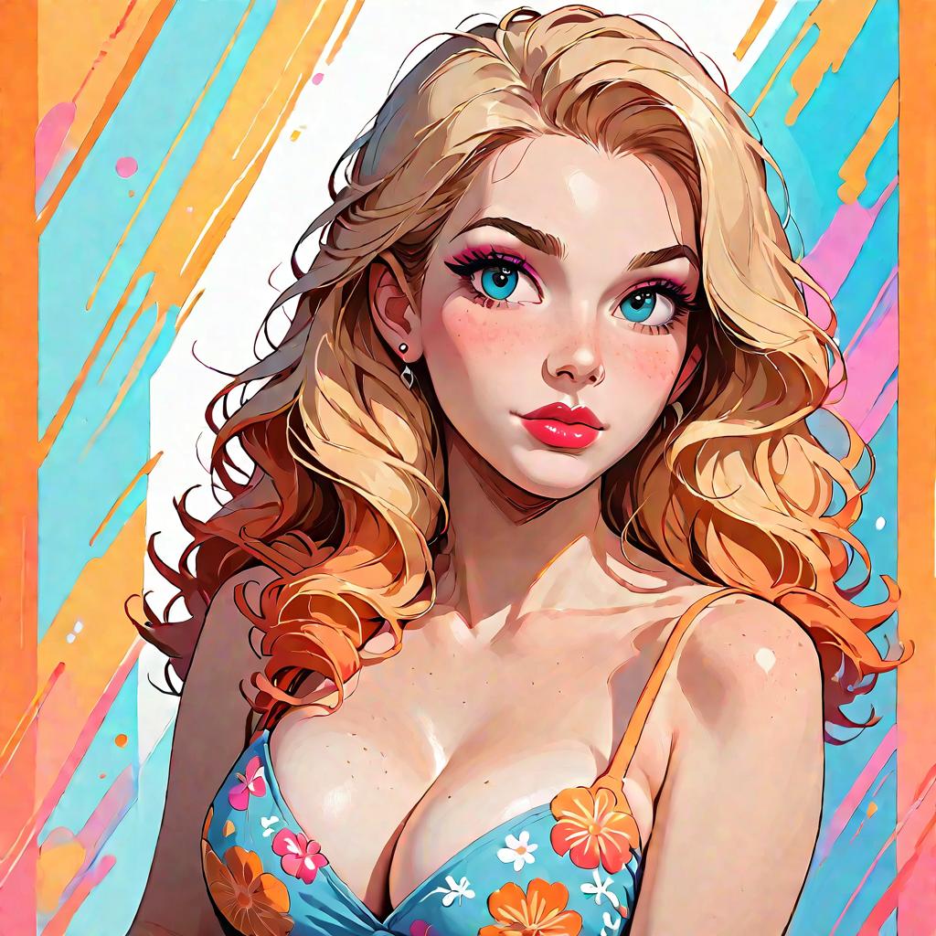 Illustration of a red-haired woman with freckles and soft curls, wearing a white spaghetti strap dress that accentuates cleavage and has a tie waist. She is posed standing with her hands gently holding the sides of her dress. The background features a vibrant, colorful abstract sky with soft clouds in pink, yellow, and blue tones, giving a dreamy and artistic atmosphere.