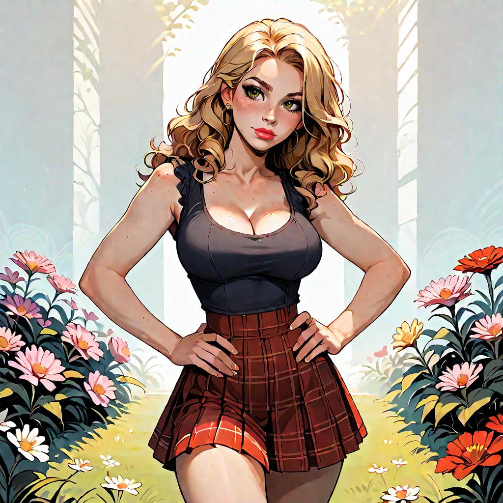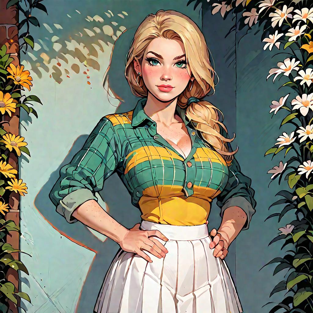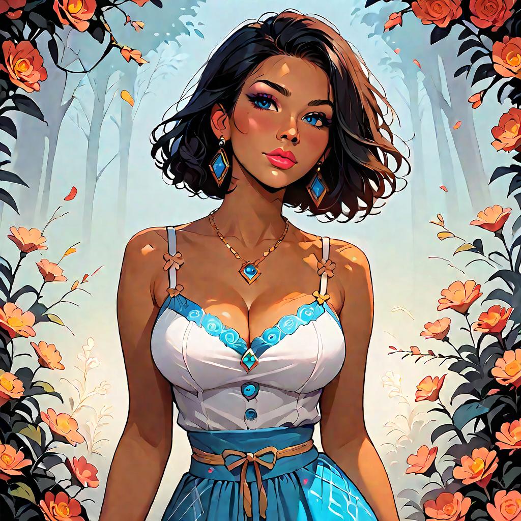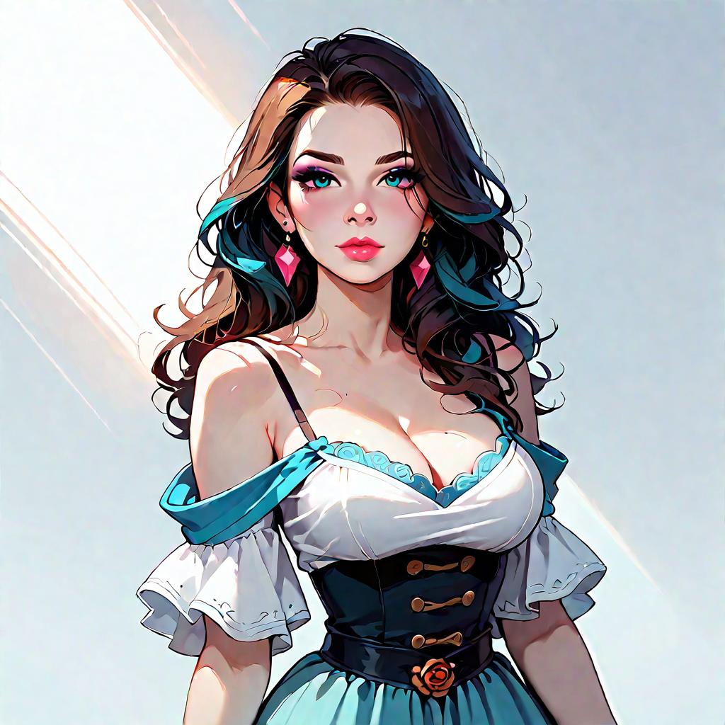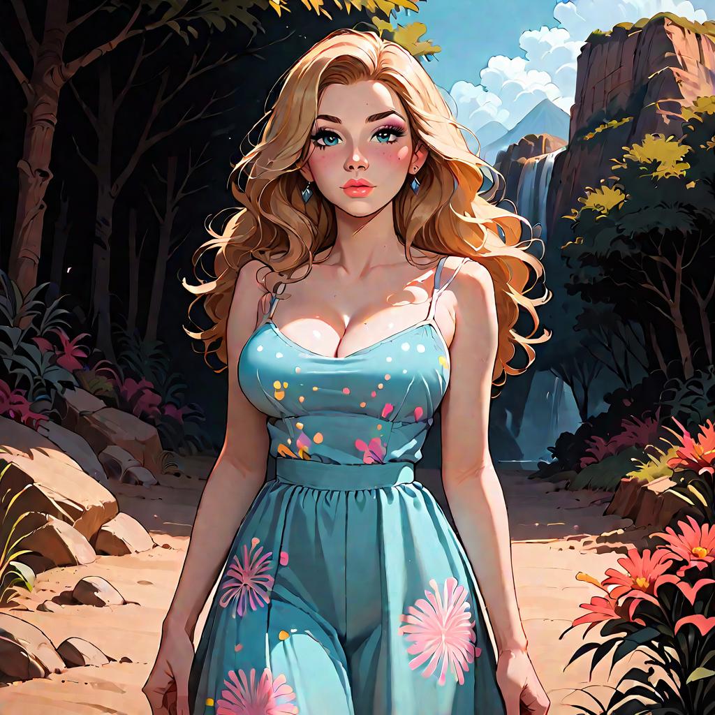 Illustration of a red-haired woman with freckles and soft curls, wearing a white spaghetti strap dress that accentuates cleavage and has a tie waist. She is posed standing with her hands gently holding the sides of her dress. The background features a vibrant, colorful abstract sky with soft clouds in pink, yellow, and blue tones, giving a dreamy and artistic atmosphere.