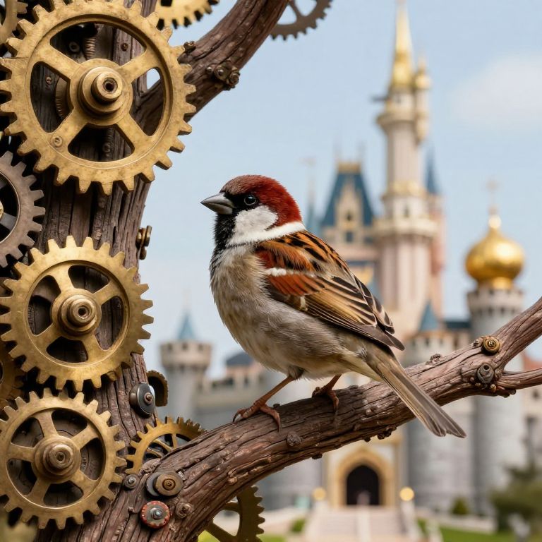 Photograph of a small, brown and white house sparrow with a red-brown head and black streaks, perched on a branch adorned with intricate, golden gears. The background features a blurred, fairy-tale castle with blue-topped spires and golden domes, set against a clear blue sky. The sparrow's feathers are detailed and textured, contrasting with the smooth, metallic gears and the rough, brown branch. The castle's soft pastels and shimmering gold accents create a whimsical, magical atmosphere. The overall image blends natural and mechanical elements with a fantasy theme.