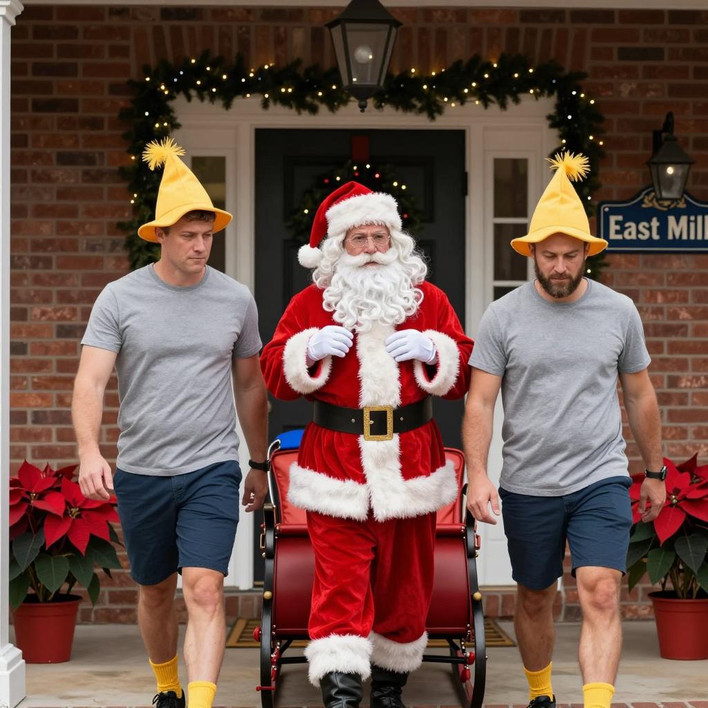Three men in yellow feathered hats and gray shirts carry Santa Claus, dressed in a red suit with white trim, through a brick doorway. Santa sits in a red sleigh. Potted red poinsettias are on the left. "East Mill" sign on the right. Christmas lights and greenery decorate the top. Santa's expression is neutral. Two men have blue hats, the third has a yellow hat. The men's legs are muscular and they wear yellow socks.
