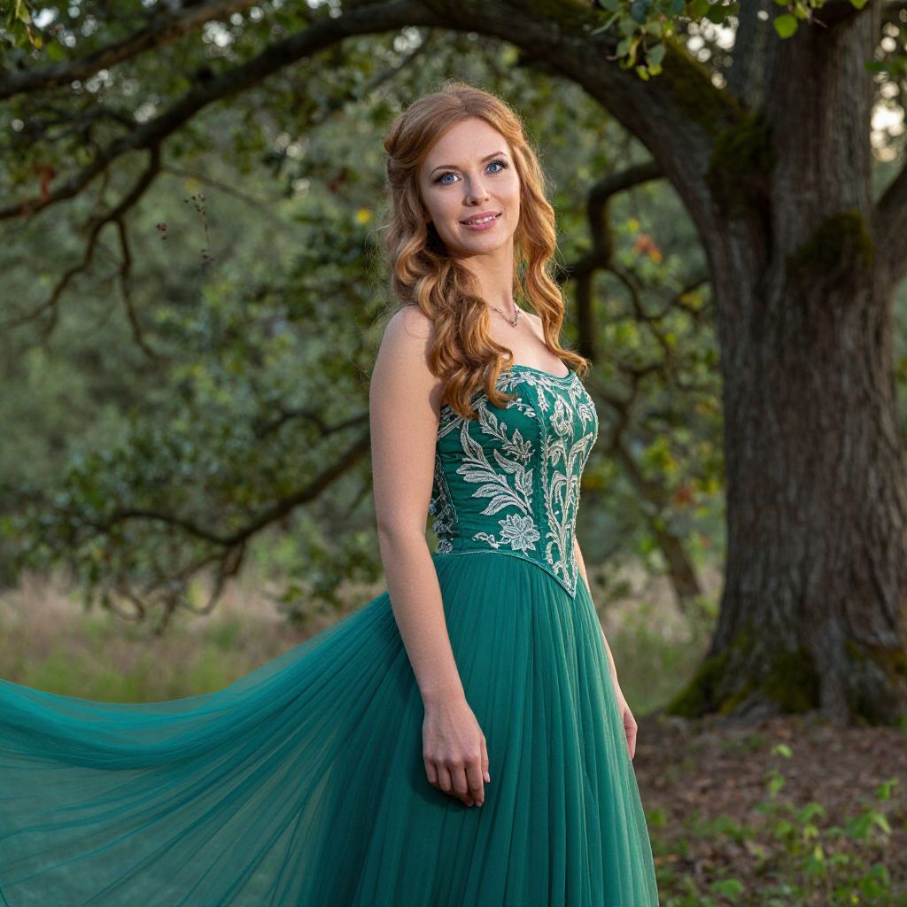 In a serene dawn setting amidst ancient oak trees, a Western European woman with captivating azure eyes and long wavy hair stands out against the lush forest. Her delicate features are illuminated by sunlight, enhancing her radiant skin and elegant emerald gown adorned with intricate silver embroidery. As she transitions from tranquility to an enigmatic smile, this hyperrealistic portrait captures both mystery and awe for nature's beauty, embodied in her flowing gown and enchanting surroundings.
