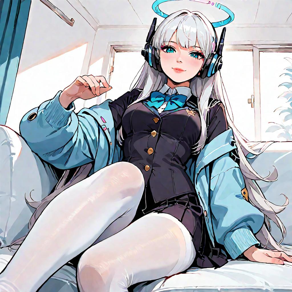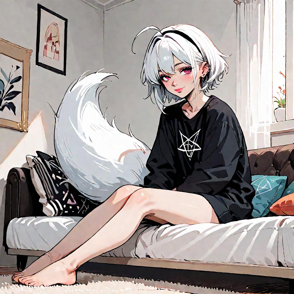 Score_9, score_8_up, score_7_up, source_anime, scissorhold, between thighs, sitting, headpat, indoors, 1boy, evil smile, 1girl, fubukibase, white blouse, detached sleeves, black shorts, blue neckerchief, thigh strap, single thighhigh, white hair, single side braid, ahoge, piercing, fox tail, pentagram