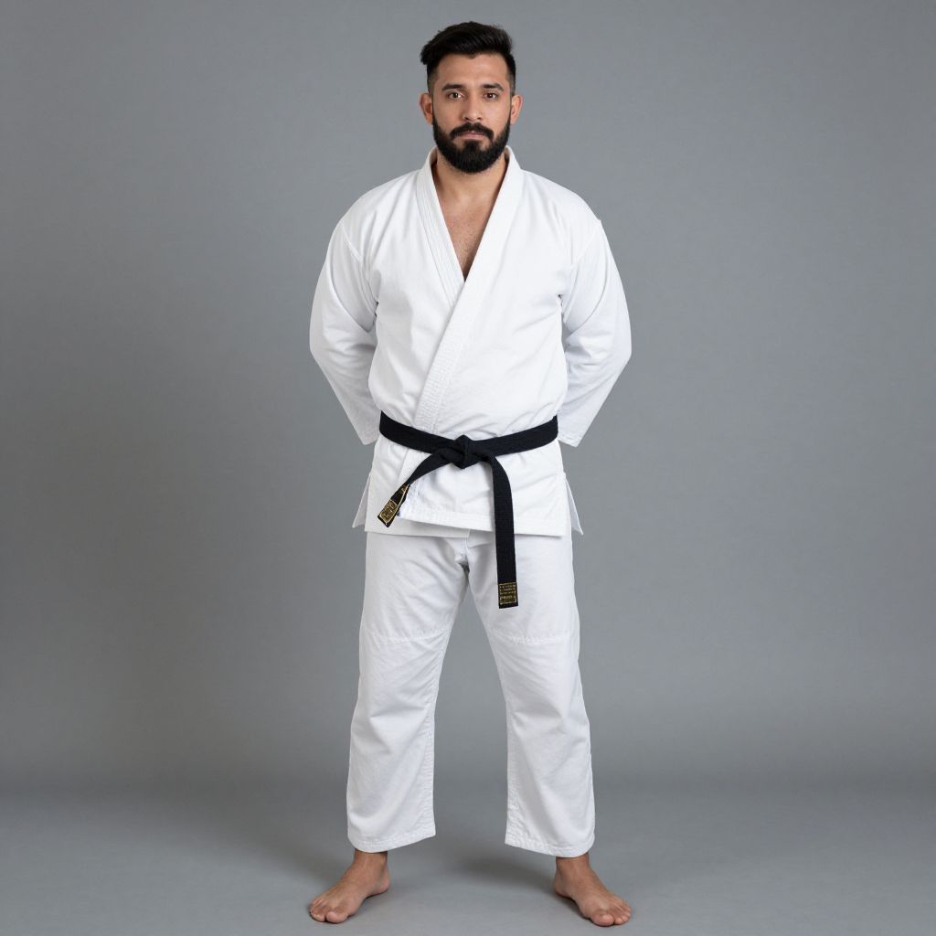 Photograph of a muscular, bearded man with short dark hair standing against a gray studio backdrop. He wears a white karate gi with a black belt tied around his waist, and he is barefoot. His hands are behind his back, and he has a serious expression on his face. The gi is slightly loose-fitting, showing the fabric's texture and folds. The lighting is even, highlighting the clean and simple composition of the image. The overall style is minimalistic, focusing on the subject's martial arts attire and stance.