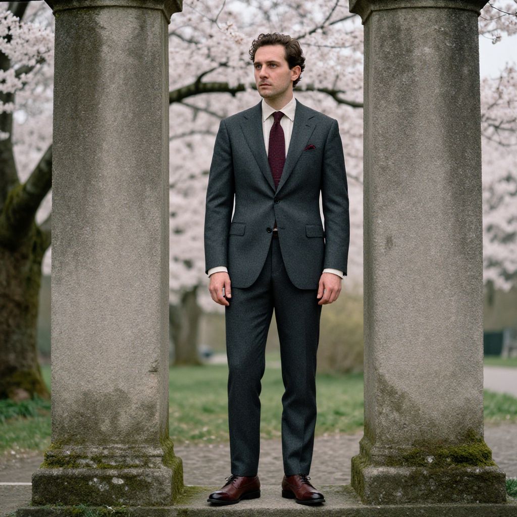 A man, charcoal grey slim-fit suit, ivory linen dress shirt, textured burgundy tie, burgundy cufflinks, brown leather brogues, ancient stone pillars, moss-covered, surrounded by cherry blossoms, medium format film, contemplative expression Man has masculine face and piercing eyes