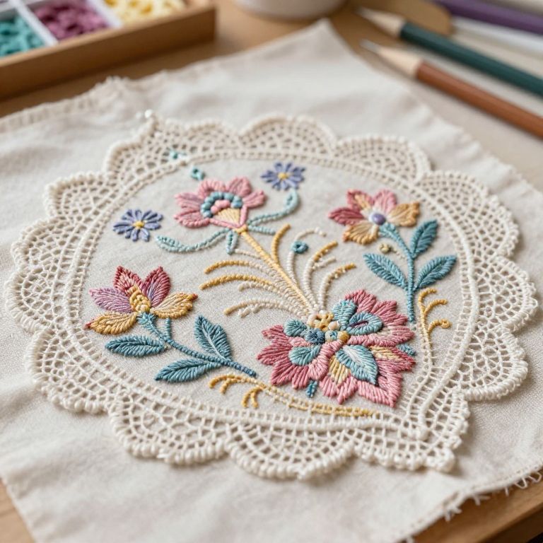 Broderie inspired design of vintage lace with ornate motifs, combining traditional needlework with modern aesthetics, featuring pastel color palette and fine thread details on textured fabric, photographed in a softly lit artisan workshop setting to accentuate depth.