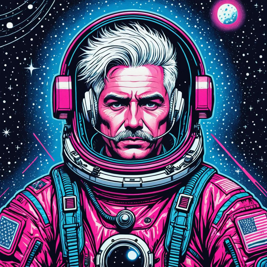 Illustration of an eccentric astronaut with buzzed platinum hair, drawn with hyper-detailed strokes. The color palette includes neon pinks, midnight blues, and glowing white accents, set against an 80s-inspired background, showcasing a whimsical aesthetic with wondrous, evocative atmosphere, perfect for art print lovers.