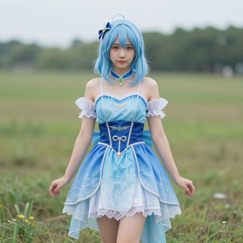 Photograph of an Asian woman with blue bob wig and blue-white frilled dress, standing in a grassy field, wearing a blue ribbon choker