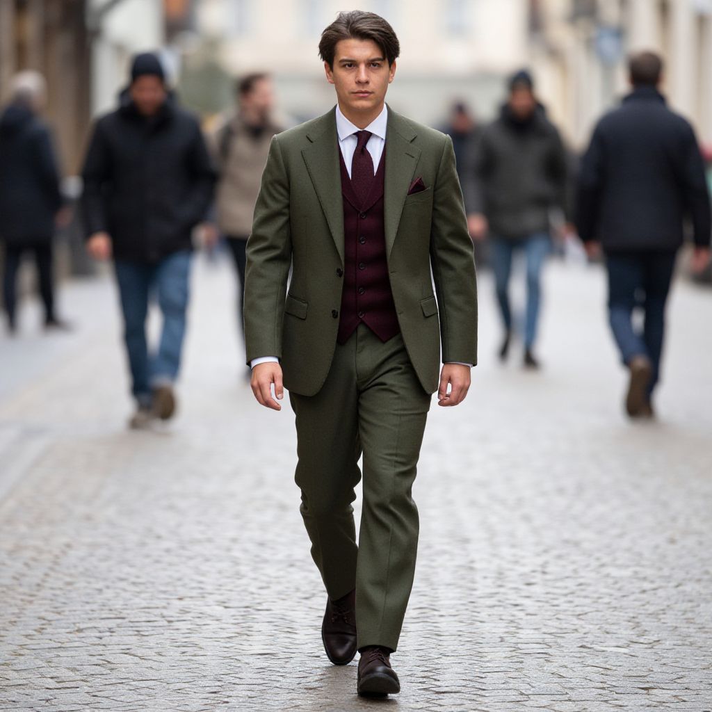 A young man confidently walks down a cobblestone street wearing a stylish olive green suit paired with a burgundy vest and tie, accented by a matching pocket square. The image captures a modern, urban fashion vibe with blurred pedestrians in the background adding depth and context to the street-style portrait.