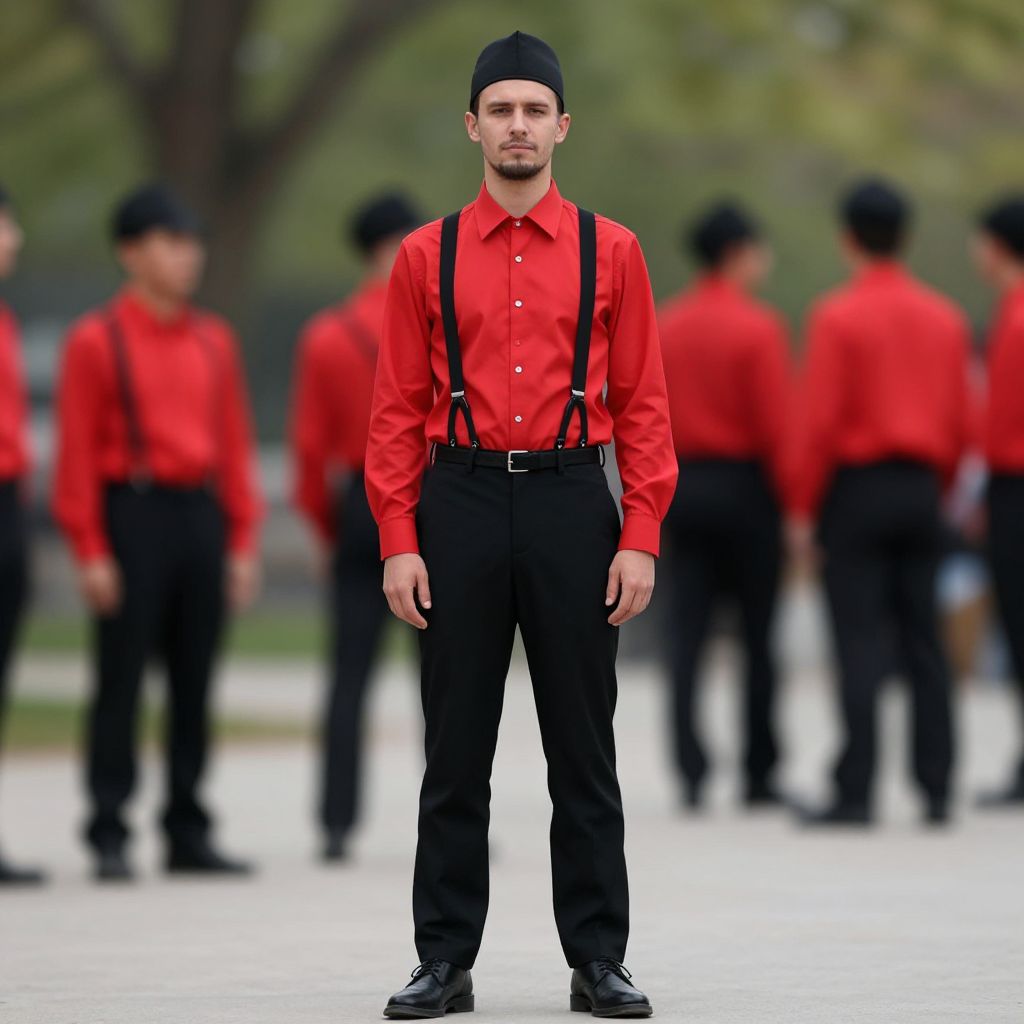 "circus trainer costume, shirt, male focus, hat, suspenders, pants, outdoors, blurry background, red shirt, collared shirt, shoes, black headwear, 1boy, standing, blurry, belt, long sleeves, full body, looking at viewer, closed mouth, black pants, multiple boys, tree, day, facial hair Realistic photo of casual sexy person with pretty face"