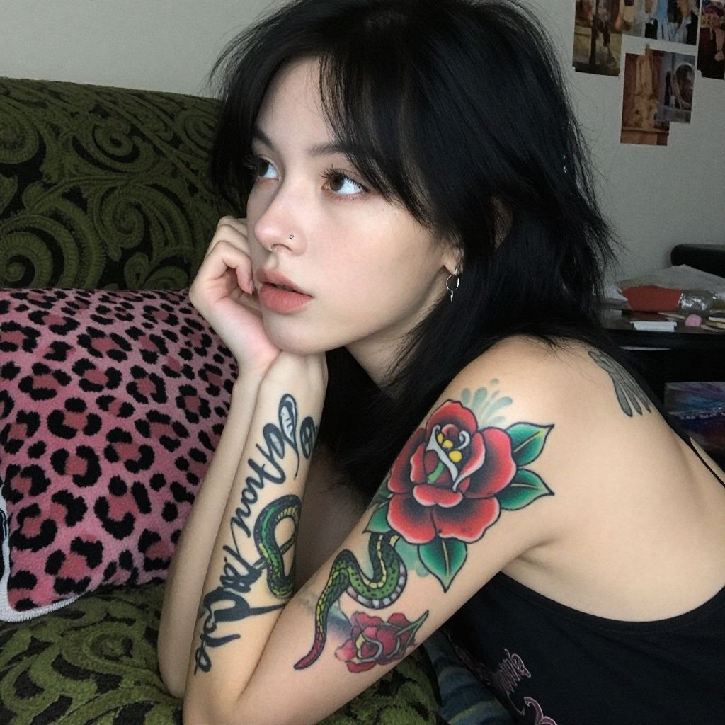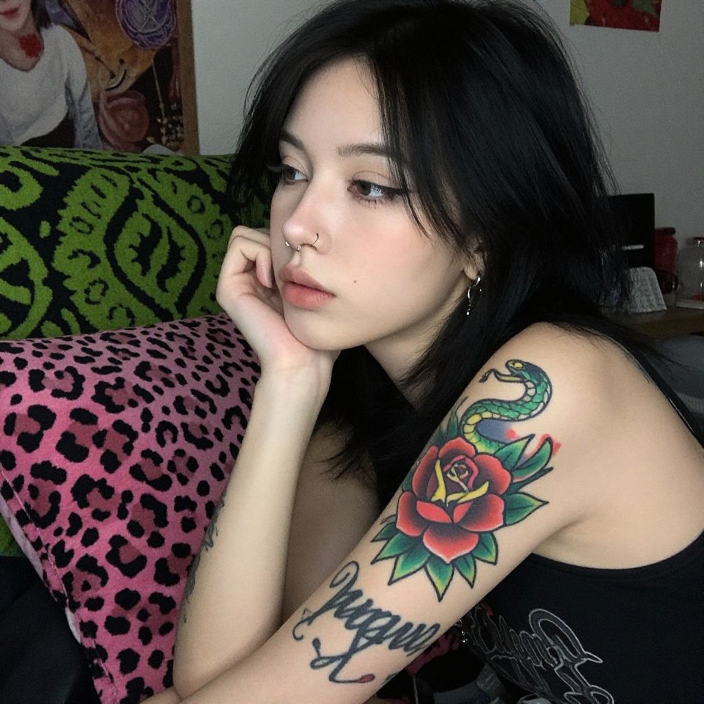 Photograph of a young woman with pale skin and black hair, showing off colorful tattoos on her left arm and shoulder. She has a large red and black rose, a green snake, and a black script tattoo. She's wearing a nose ring and silver earrings, with a pink and black leopard print pillow and a green patterned blanket in the background. She's resting her chin on her hand, looking to the side. The room has a cozy, cluttered vibe.