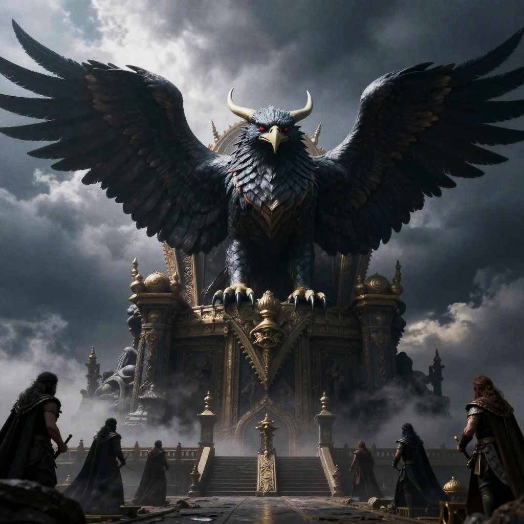 Digital fantasy artwork: massive black-feathered eagle with horns dominates grand golden throne, surrounded by robed figures on misty steps.