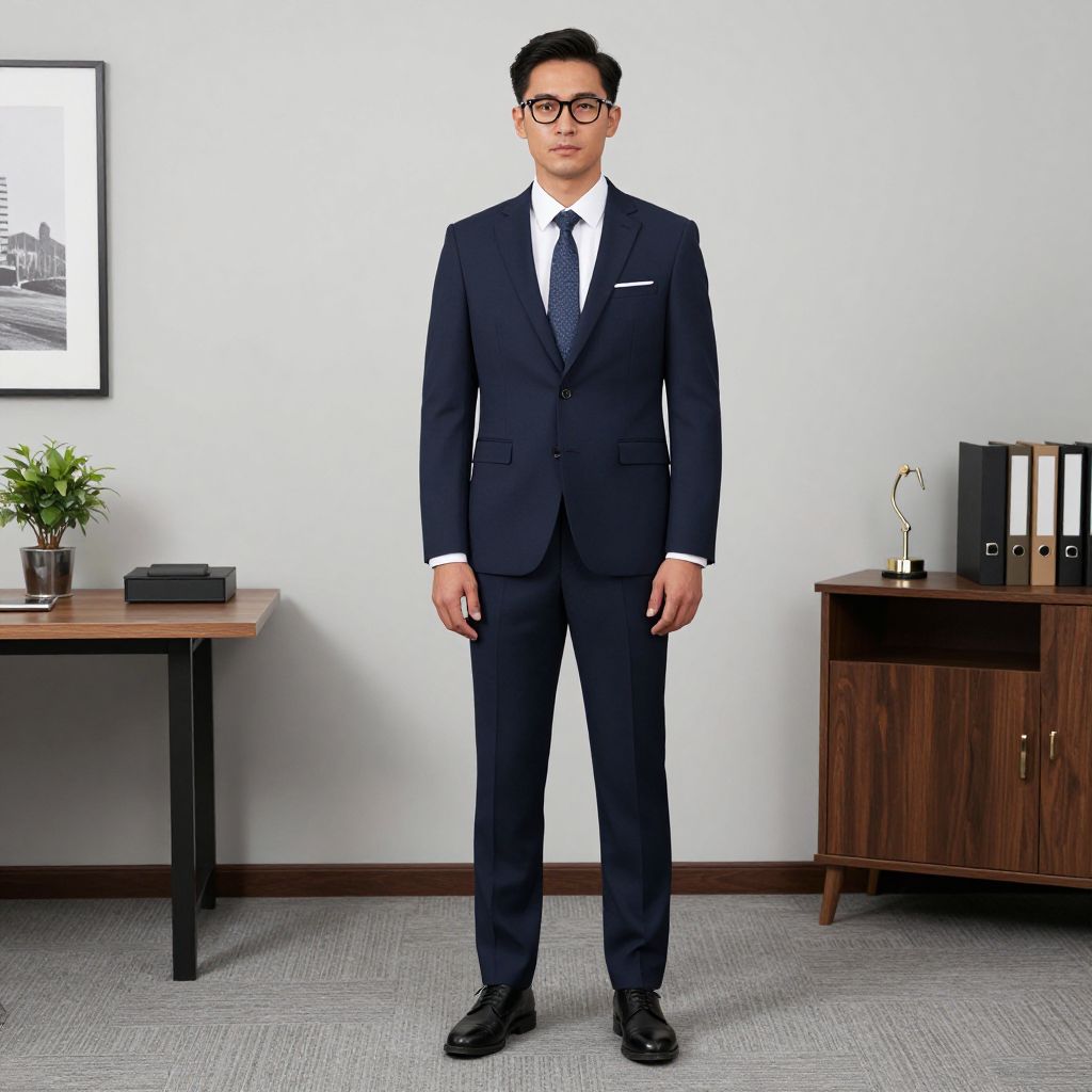 Office Wear Stylish Costume, man in a suit and glasses standing in a room