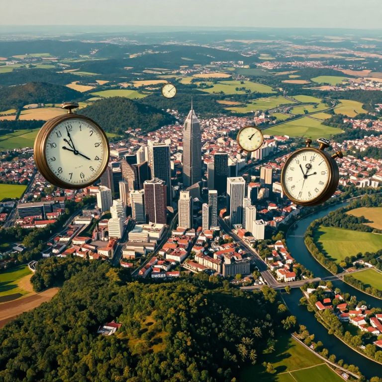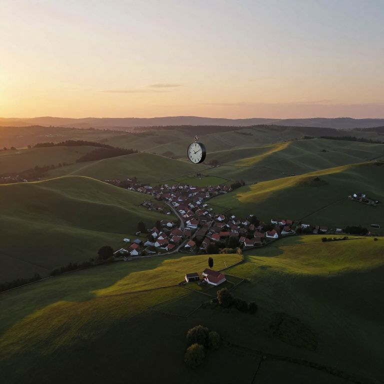 Photorealistic CGI image of a tall, white, lattice-style clock tower with a blue clock face at the top, surrounded by four floating, ghostly clock faces in different positions. The tower is situated in a rural landscape of green fields, trees, and small houses. The background features a bright blue sky and distant, patchwork fields. The floating clocks are semi-transparent with white faces and black hands, creating a surreal effect. The image combines realistic textures with fantastical elements, highlighting a contrast between the everyday and the dreamlike.