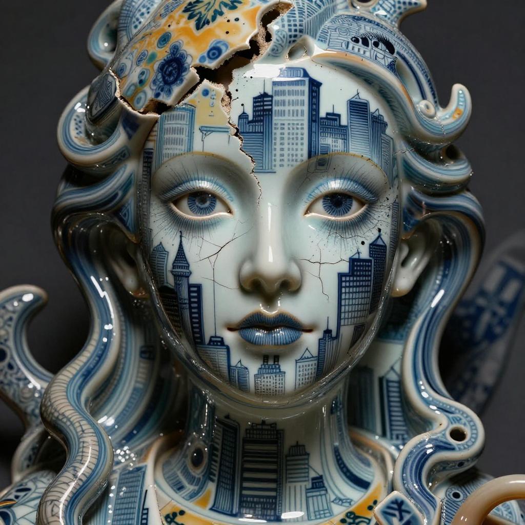 Cracked Porcelain Cityscape Neo-Noir Portrait
