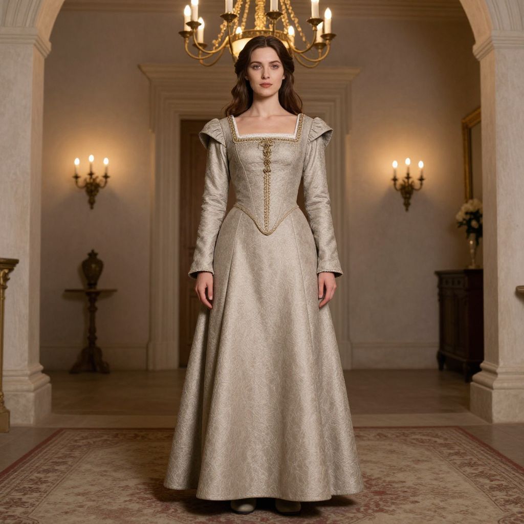 Photograph of a woman with long brown hair in an elegant, silver, medieval-style gown with square neckline and puffed sleeves, standing in an op