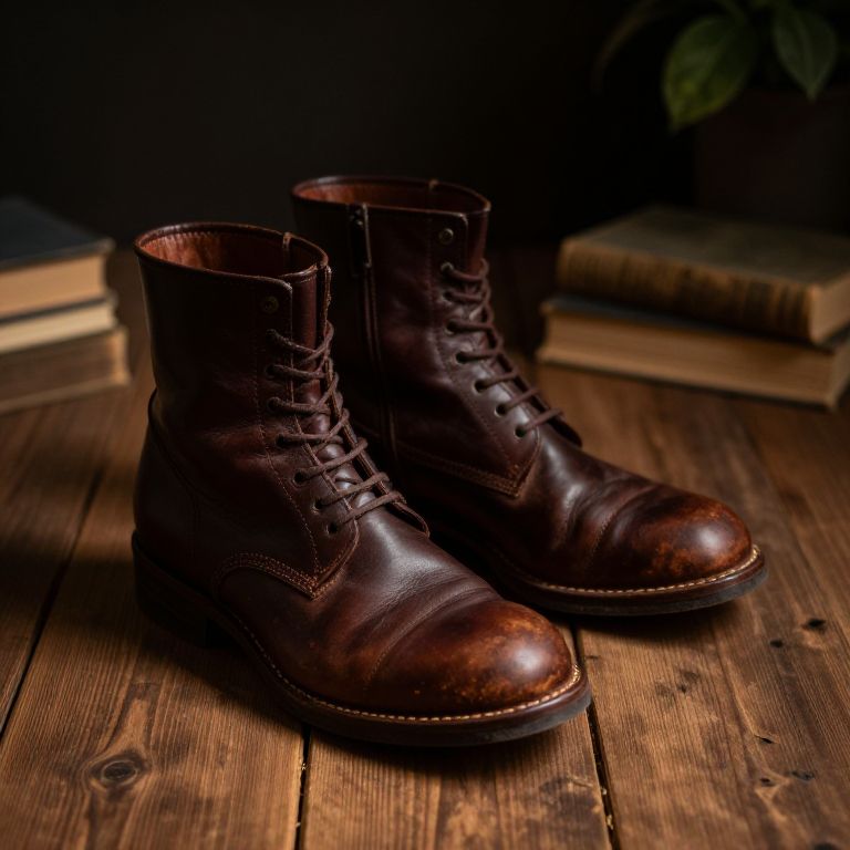 Dunkelbraune worn leather boots on rustic wooden floor, vintage style, intricate stitching details, moody soft shadows, warm earthy tones, indoor setting with old books and plants nearby