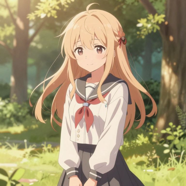 Yellow hair anime girl sitting on a grassy hill under a cherry blossom tree during spring, soft sunlight filtering through pink petals, detailed nature background with gentle breeze, expressive eyes shining with hope and determination in a colorful, painterly anime style.