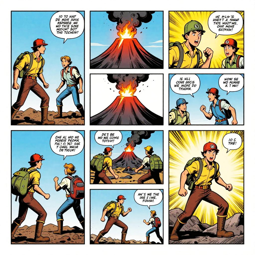 Volcano comic strip, an adventurous storyline featuring explorers approaching an active volcano, illustrated with a mix of suspense and humor, sharp lines and high contrast colors, classic comic book style