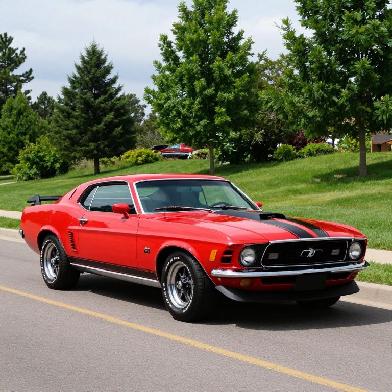 Photograph of a bright red 1970s Ford Mustang fastback driving on a suburban street. The car has black racing stripes down the center, chrome accents, and black wheels with polished hubcaps. The background features a lush green lawn with several trees, a small red car parked in the distance, and a clear blue sky. The road has yellow lane markings, and the car is positioned slightly to the left, facing forward. The image has a vibrant, high-contrast style, highlighting the car's glossy finish and the surrounding greenery.