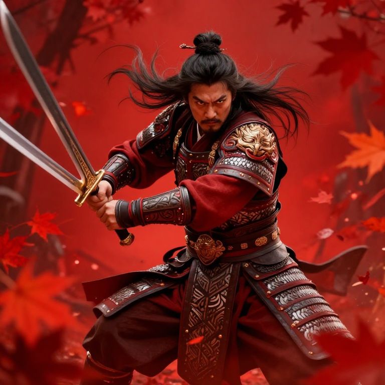 Digital art of fierce samurai with black hair in topknot, intense expression, wielding sword, detailed red and gold armor, red leaf-filled background