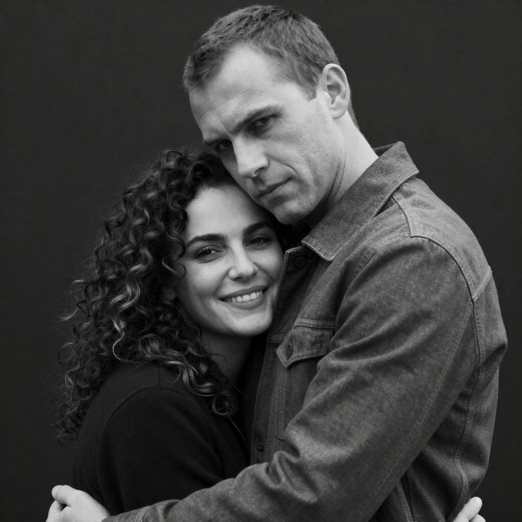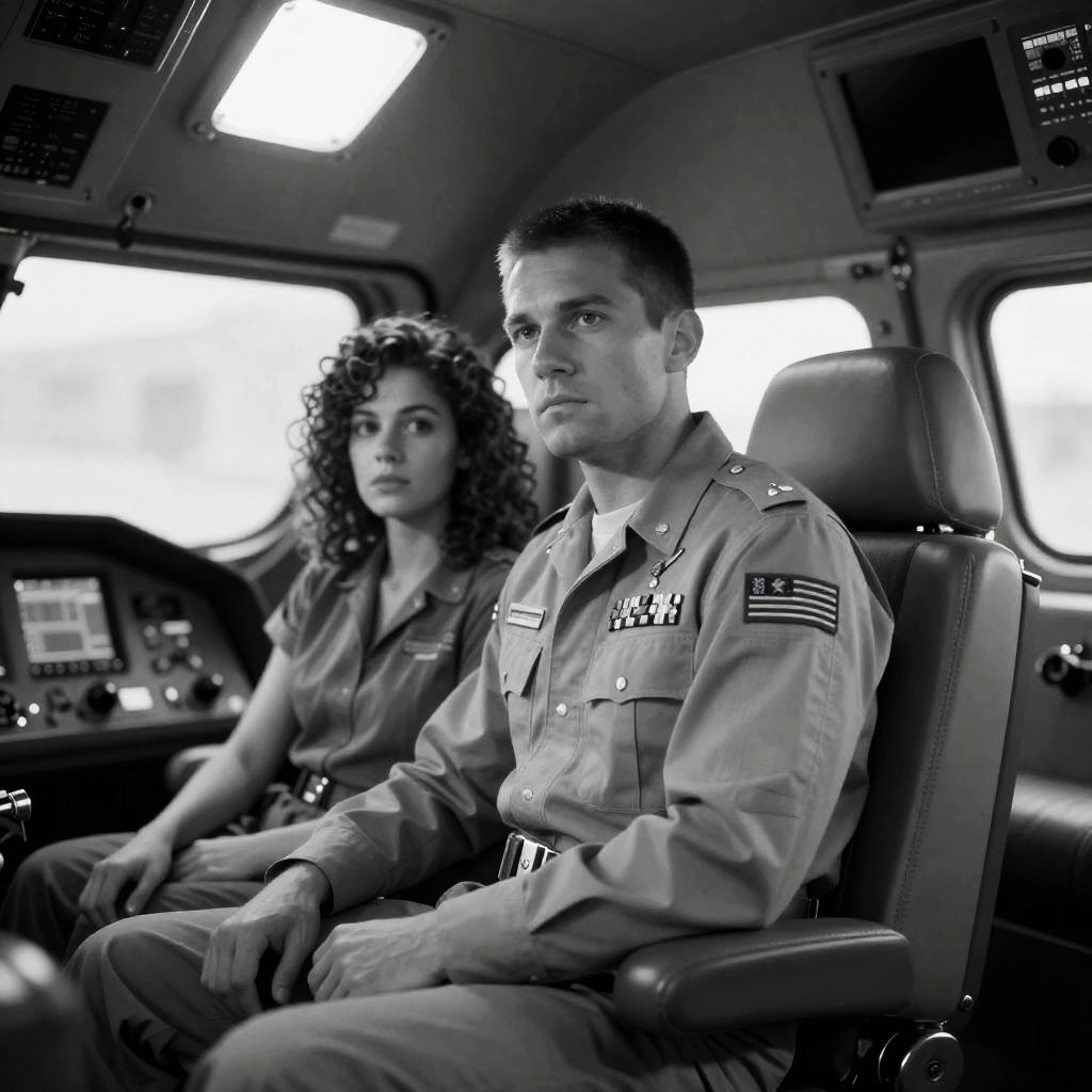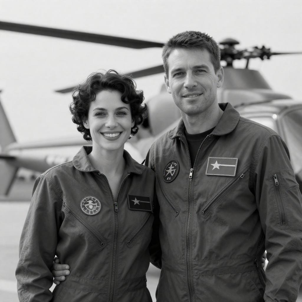 Black-and-white photograph of a smiling woman with short, curly hair and a man with short, dark hair, standing close together. Both wear dark, unzipped flight suits with patches on the chest. The man's right arm is around the woman's waist. Helicopter blades are visible in the blurred background.