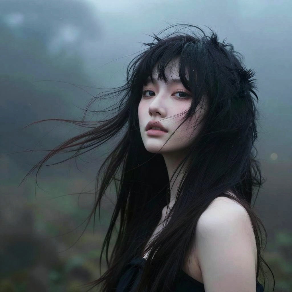 Emo hair black flowing wildly in the wind, with spiky edges and asymmetrical cut, in a foggy forest background, ethereal and mysterious mood, soft focus with bokeh lights, dramatic contrast between hair and pale skin, cinematic and artistic expression.