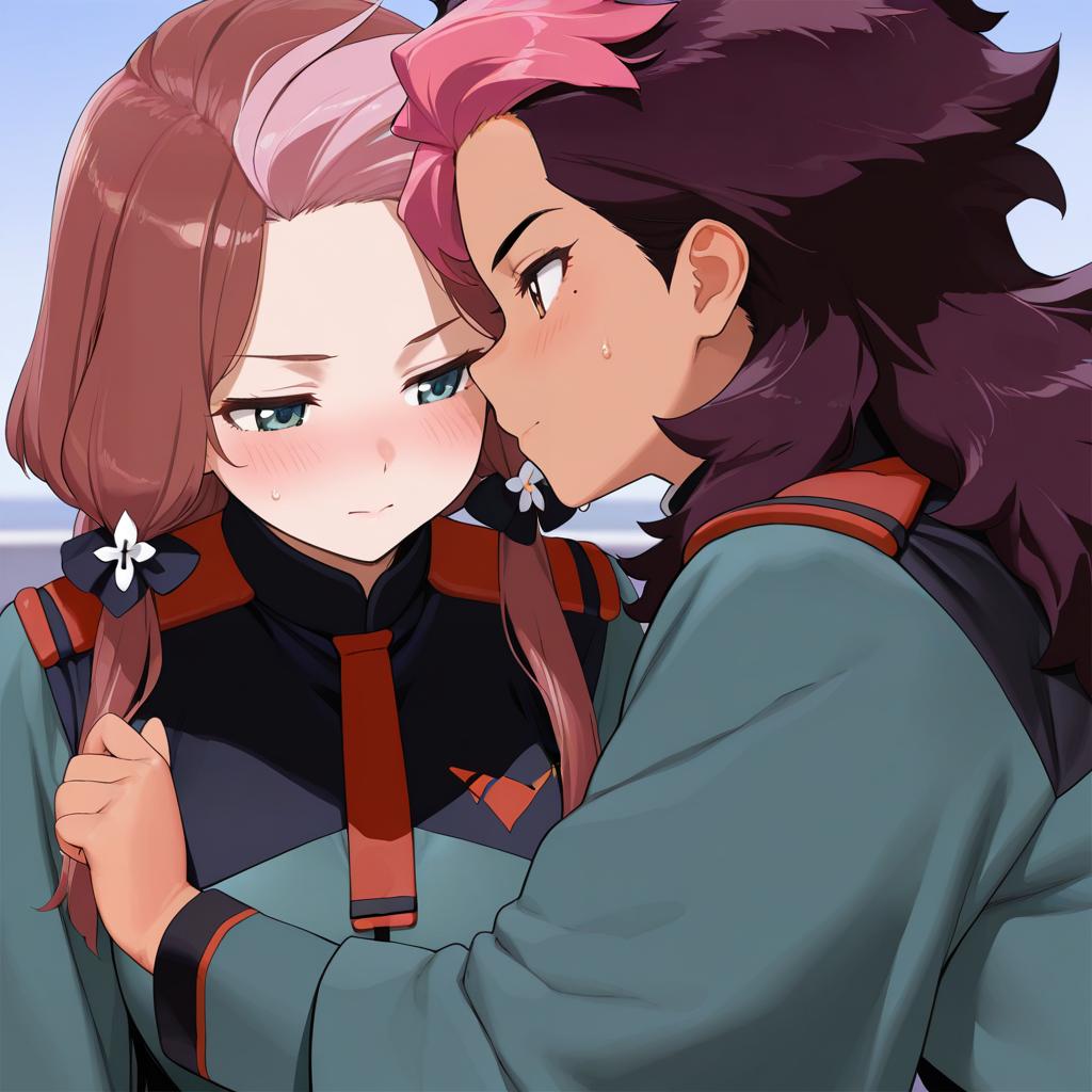 Digital illustration of two anime characters in Asticassia school uniforms, featuring one male character with two-tone pink and brown long hair, tan skin, and earnest expression leaning close to a female character with long brown hair, blue eyes, and a mole under her eye. Both characters exhibit subtle blushes and sweat drops, suggesting emotional tension or closeness. The artwork is styled in a polished anime aesthetic.