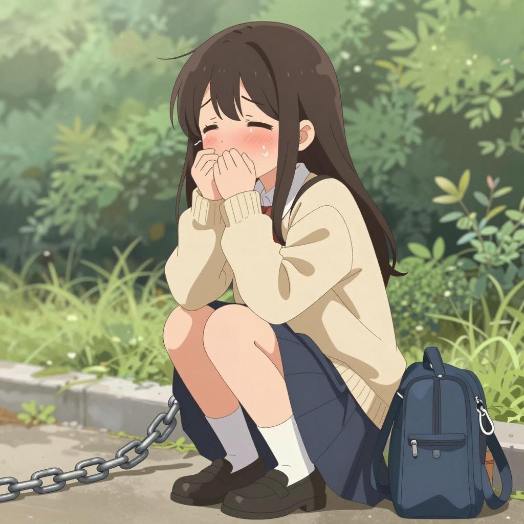 Two anime characters in a forest. The girl with long black and blue hair, wearing a black school uniform, leans forward. The boy with brown hair and a white mask with red circles, in a black hoodie with white Japanese characters, looks up. Pink flowers in the foreground. Sunlight filters through trees. Both characters have serious expressions. CkS-JAPAN on the right.
