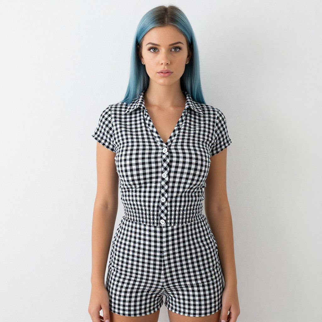 Photograph of a woman with long blue hair, wearing a black and white gingham button-up romper, standing against a plain white background.