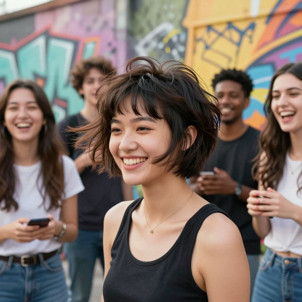 Dynamic scene showing a free buzz cut filter effect on a diverse group of friends, energetic and joyful expressions, vibrant outdoor setting with soft sunlight, colorful graffiti walls, realistic and artistic blending of hair and skin tones.