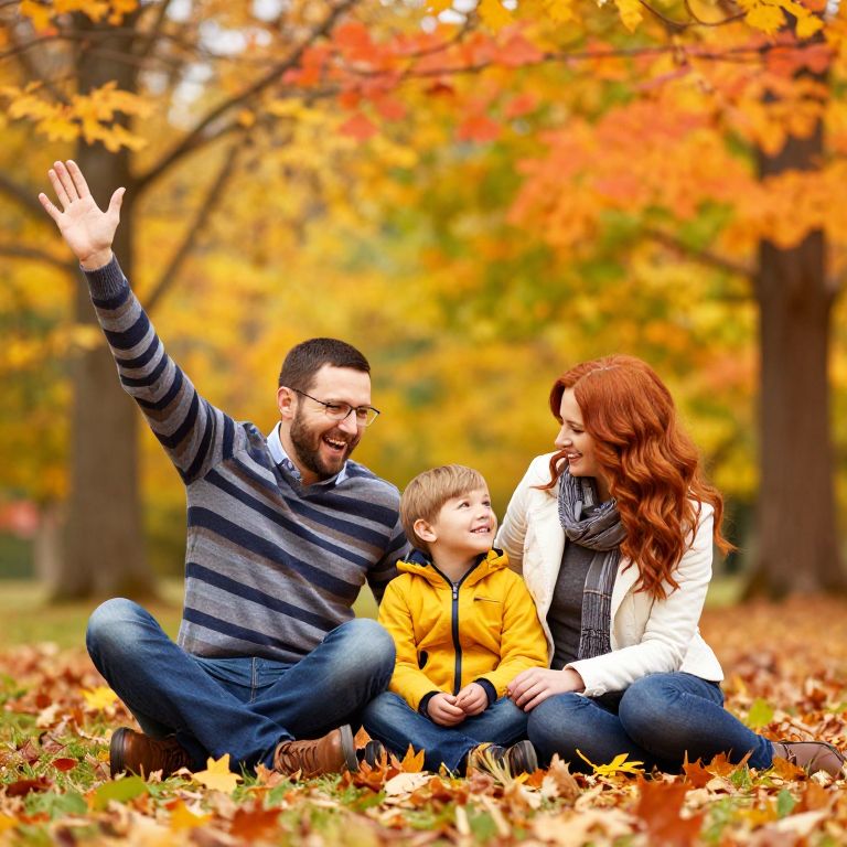 Photograph of a happy family sitting on the ground in a vibrant autumn park. The dad, with glasses and a striped sweater, raises his arms excitedly. The mom, with long red hair and a white jacket, smiles at him. Their young son, in a yellow jacket, sits between them, also smiling. Orange and yellow leaves are scattered around them, and the background is filled with colorful fall trees.