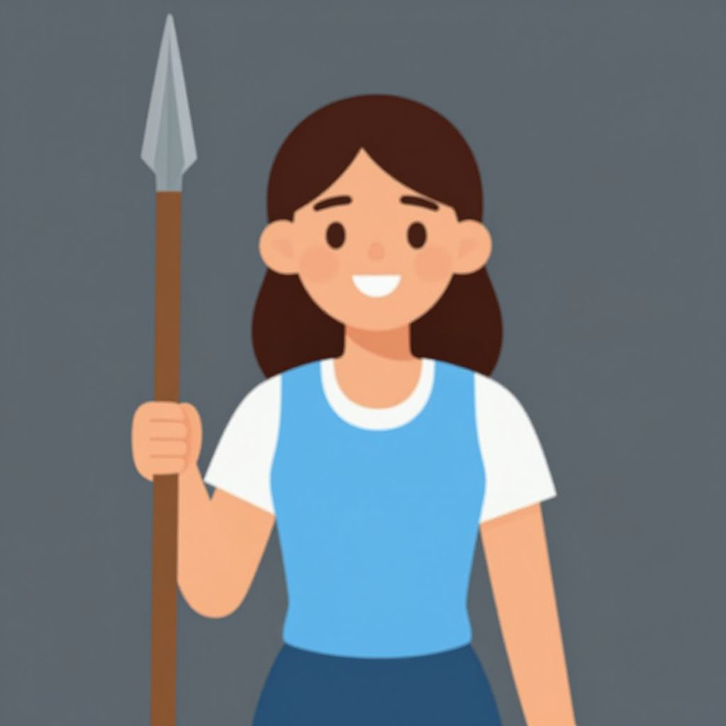 Digital drawing of a smiling girl with brown hair, wearing a white shirt and blue shorts, holding a spear against a blue background.