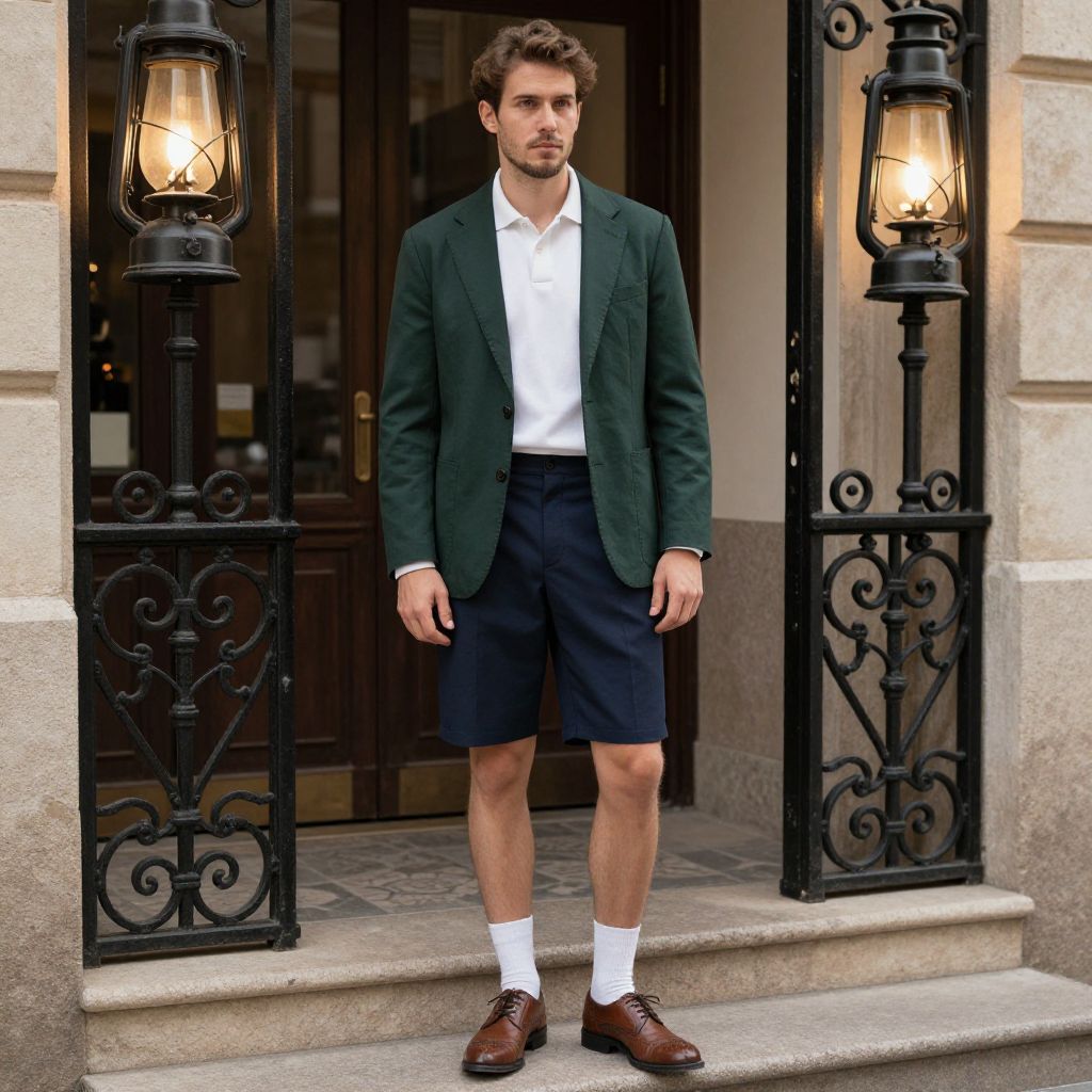 Photograph of a handsome man with short brown hair, wearing a green blazer, white shirt, black shorts, white socks, brown loafers,