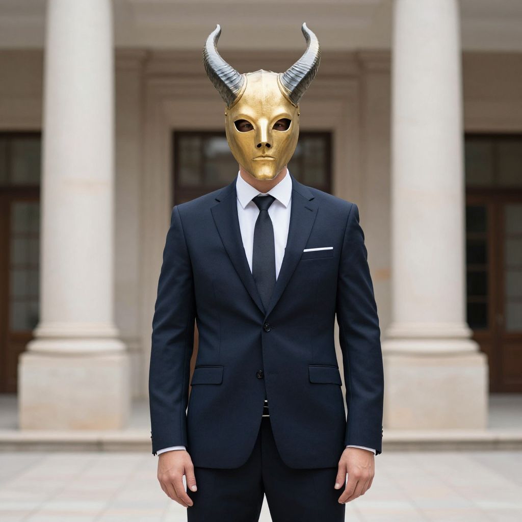 Photograph of a man standing in front of a classical building with white columns. He is wearing a black suit with a white dress shirt and black tie. His face is covered by a gold-colored, horned mask with dark eye holes, resembling a mythical or demonic figure. The background features two large windows with dark frames. The man's arms are relaxed by his sides, and the overall composition is centered and symmetrical. The lighting is bright, highlighting the contrast between the dark suit and the gold mask.
