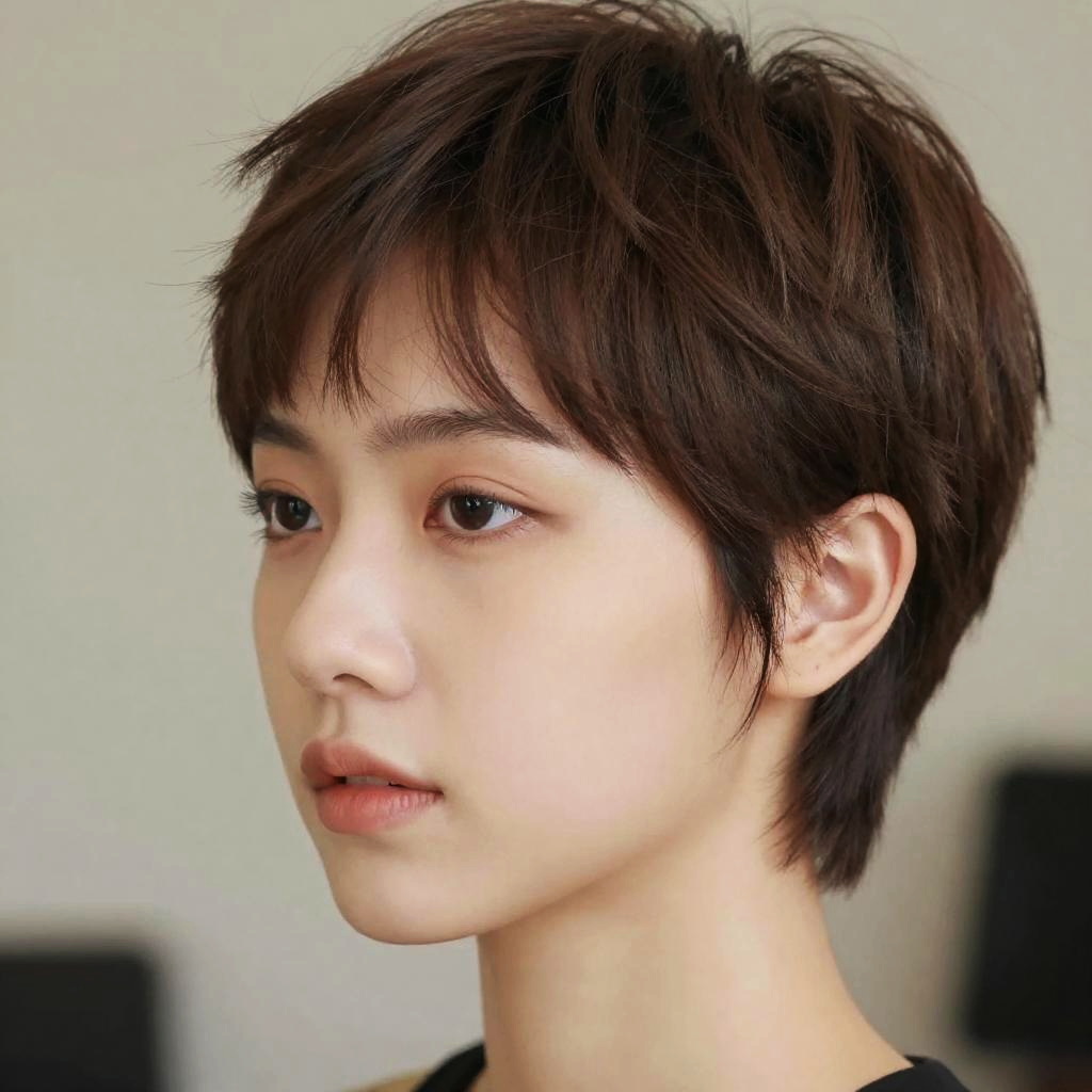 What would I look like with a pixie cut, close-up portrait of a young woman with delicate facial features, soft lighting, stylish short hair, warm natural tones, modern fashion, subtle makeup emphasizing eyes, background softly blurred to highlight the hairstyle.