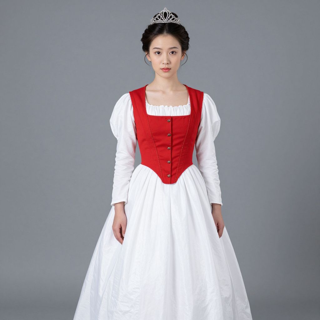 Photograph of an East Asian woman standing against a plain gray background. She wears a white, long-sleeved, full-skirted dress with a red, square-necked bodice featuring button details. Her black hair is styled in a neat updo, topped with a silver tiara. She has light skin and a neutral expression. The white dress contrasts sharply with the red bodice, creating a classic, fairy-tale-inspired look. The overall style is reminiscent of a princess or ball gown. The image is well-lit, highlighting the textures and colors of the dress.