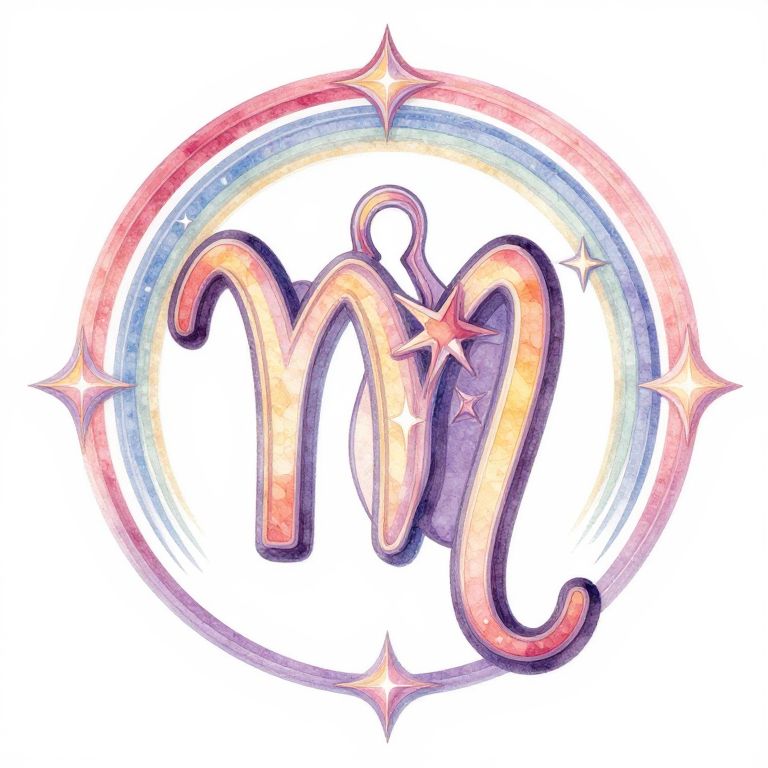 Watercolor-style Scorpio symbol with a pink, purple, and yellow gradient, surrounded by a glowing, rainbow-colored circle with sparkling stars.