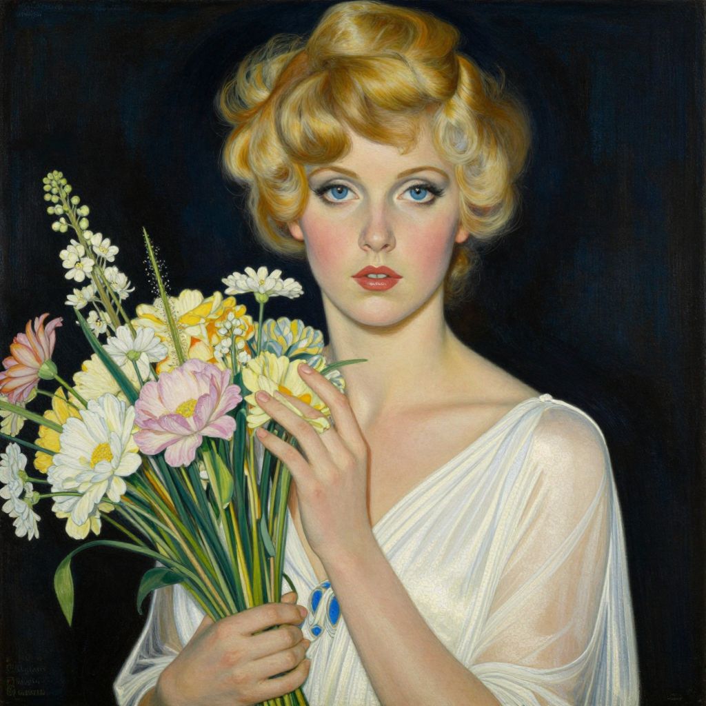 A hyperdetailed, high-quality Art Deco-style painting of a beautiful, twenty-year-old blonde woman with big blue eyes, wearing a white dress and holding a bouquet of flowers, reminiscent of Tamara de Lempicka's style.